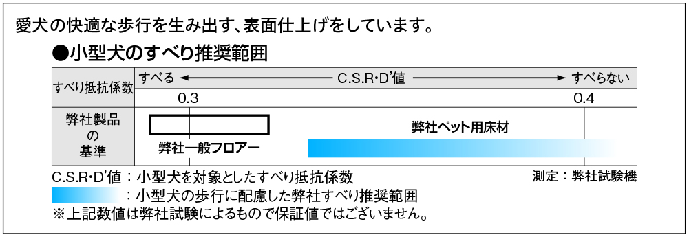 床材料構法研究会の研究データを参考にしながら調査・研究を行い、犬の歩行に配慮した“滑りにくさ”を当社規格値として設定。この規格値をクリアする表面仕上げを施しています。