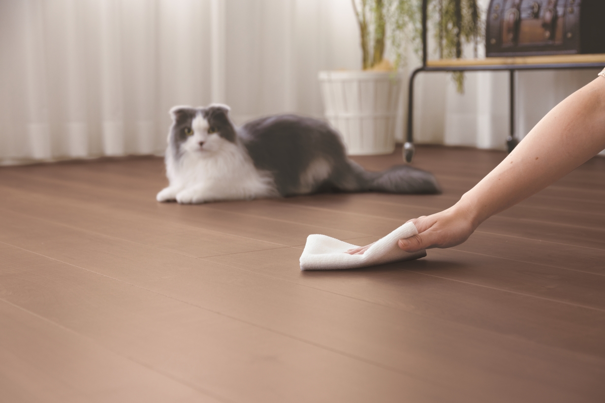 優れた耐傷性、防汚性により、爪痕など室内でペットを飼うことで生じる床面の傷がつきにくくなっているとともに、よだれや尿(アンモニア)、吐き戻しにも配慮しています。