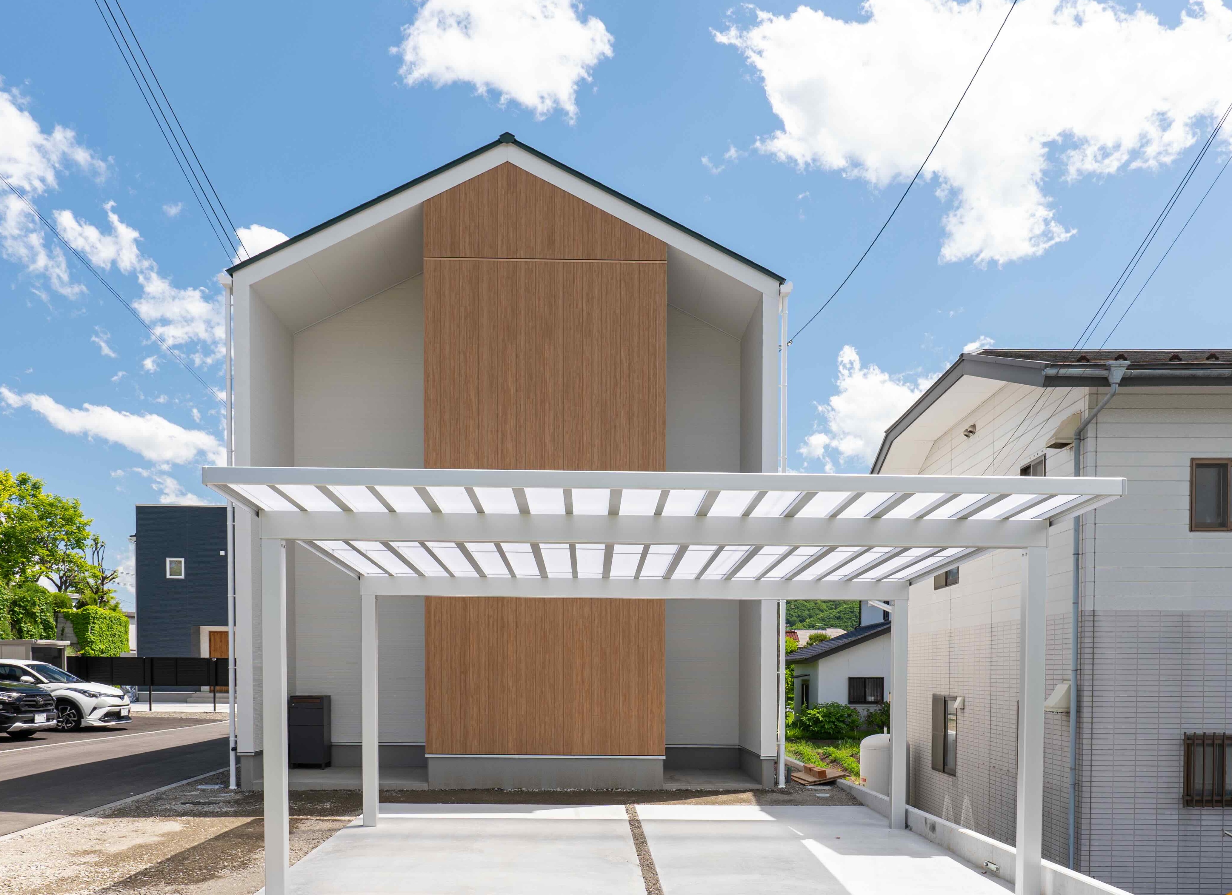 3LDK+趣味のスペースと収納の多い、木の温かみを感じる家に住みたいというお話をもとに間取り、外観設計しました。北側接道の為、ファサードを大事にしたく、凹凸をどこにどう配置するか何度も考え、屋根のかけ方や勾配の向きなど、ソーラーパネルの縛りもありながらも、外観からも目を惹くように設計しました。ジョリパットと木目のサイディングというシンプルながらも素材感を大事にして、家に入る前から木の家を感じてもらえるような見た目、組み合わせにしました。また、植栽の配置や照明の当たり方などの組み合わせと雨に濡れないカーポートの距離感を大事に配置検討しています。