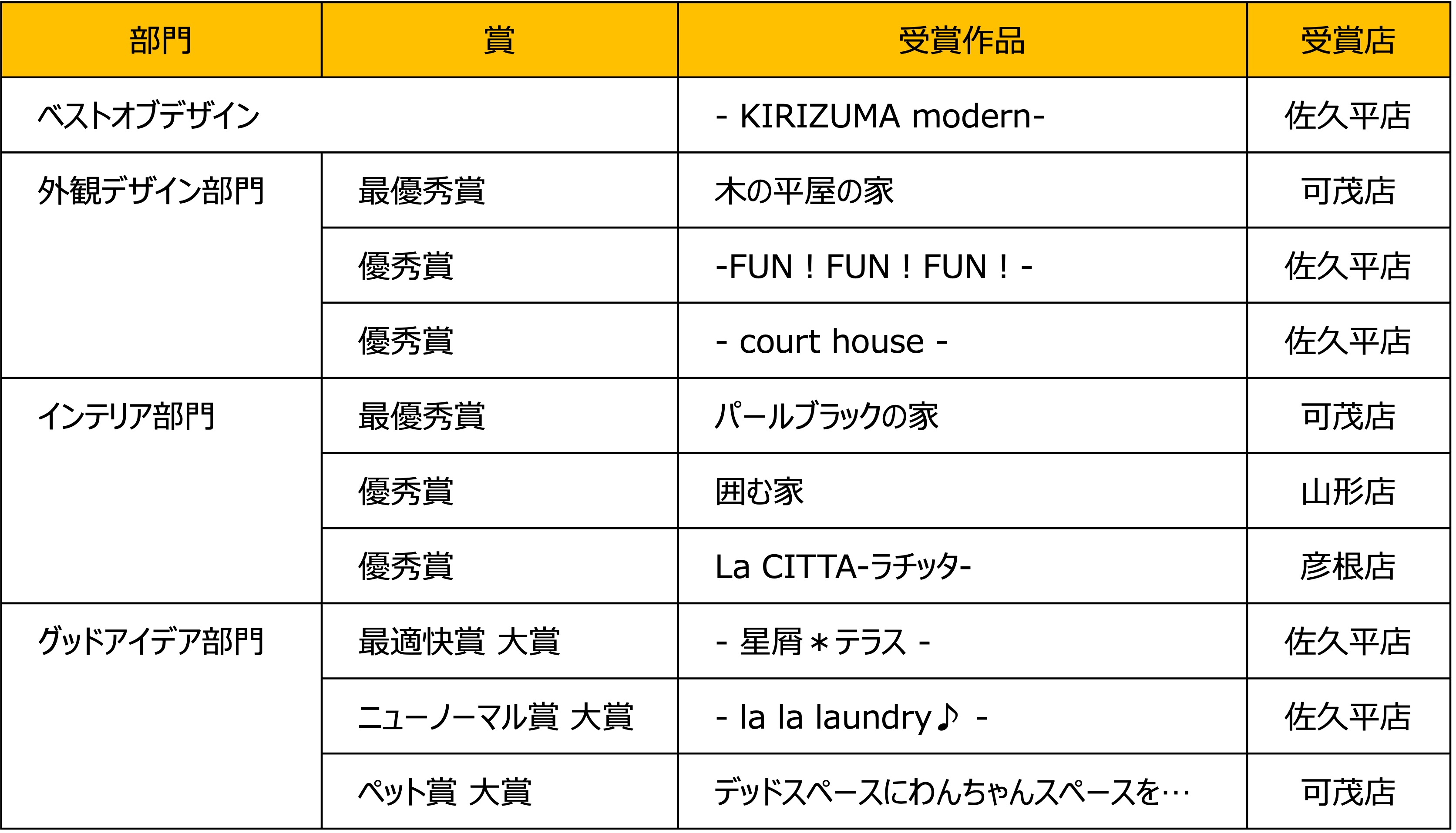 ・選考基準:フィアスホーム加盟店及び本部社員の投票により選考。ベストオブデザイン賞の選考にあたっては、断熱・気密、日射遮蔽、日射熱取得、通風利用、昼光利用のパッシブデザインの5要素の採用に立地条件を加味して決定