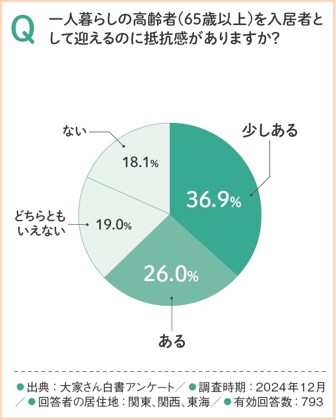 「大家さん白書2025」の調査によると、一人暮らしの高齢者(65歳以上)を賃貸物件に受け入れることについて、大家さんの約6割(63.0%)が「抵抗感がある」(19.0%)または「少しある」(36.9%)と回答しています。これは、多くの大家さんが高齢者の入居に対して、何らかの心理的なハードルを感じている現状を示しています。