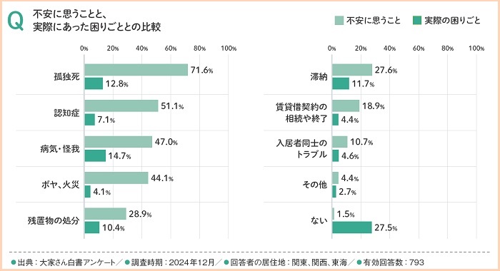 大家さんが高齢者の入居に関して抱く不安は多岐にわたりますが、最も多く挙げられたのは「孤独死」で、実に71.6%に達しました。これに次いで、「認知症」が51.1%、「病気・怪我」が47.0%、「ボヤ、火災」が44.1%と続き、健康面や生活面でのトラブルへの懸念が高いことが示されています。