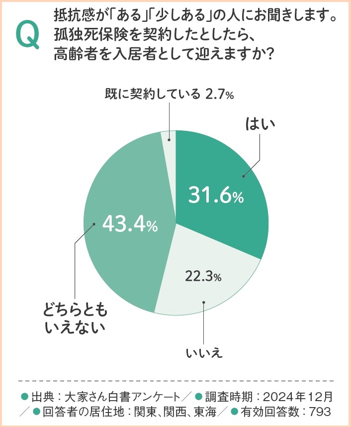 また、「孤独死保険を契約したとしたら、高齢者を入居者として迎えますか?」という問いに対しても31.6%が「はい」と回答しました。これらのデータは、具体的なサポート体制があれば、抵抗感のある大家さんの約3割が受け入れを前向きに検討する可能性を示しています。