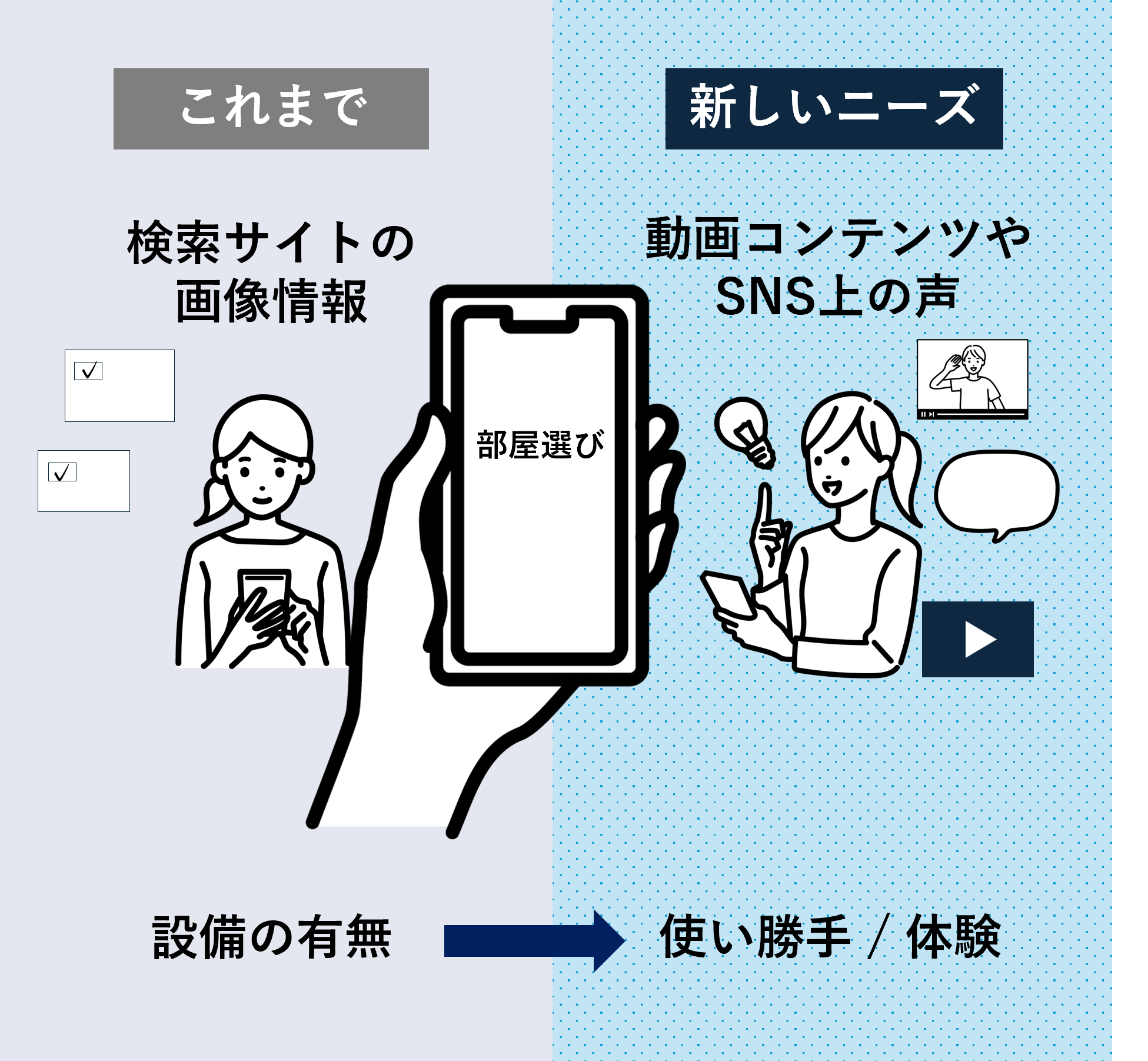 昨今、賃貸のお部屋選びで求められるものは、単なる「機能の有無」から「住まいを通じた体験の質」へと変化しています。SNSや動画サイトで部屋の「雰囲気」や「暮らしのイメージ」を確認できることが当たり前になり、単に「人気の設備がある」「インターネットが使える」等の表面的な情報だけでなく、「見た目のデザインだけでなく使い勝手はどうか」「日々の暮らしにどれだけ貢献するか」といった実際の体験を想定した実用性が求められるようになっています。