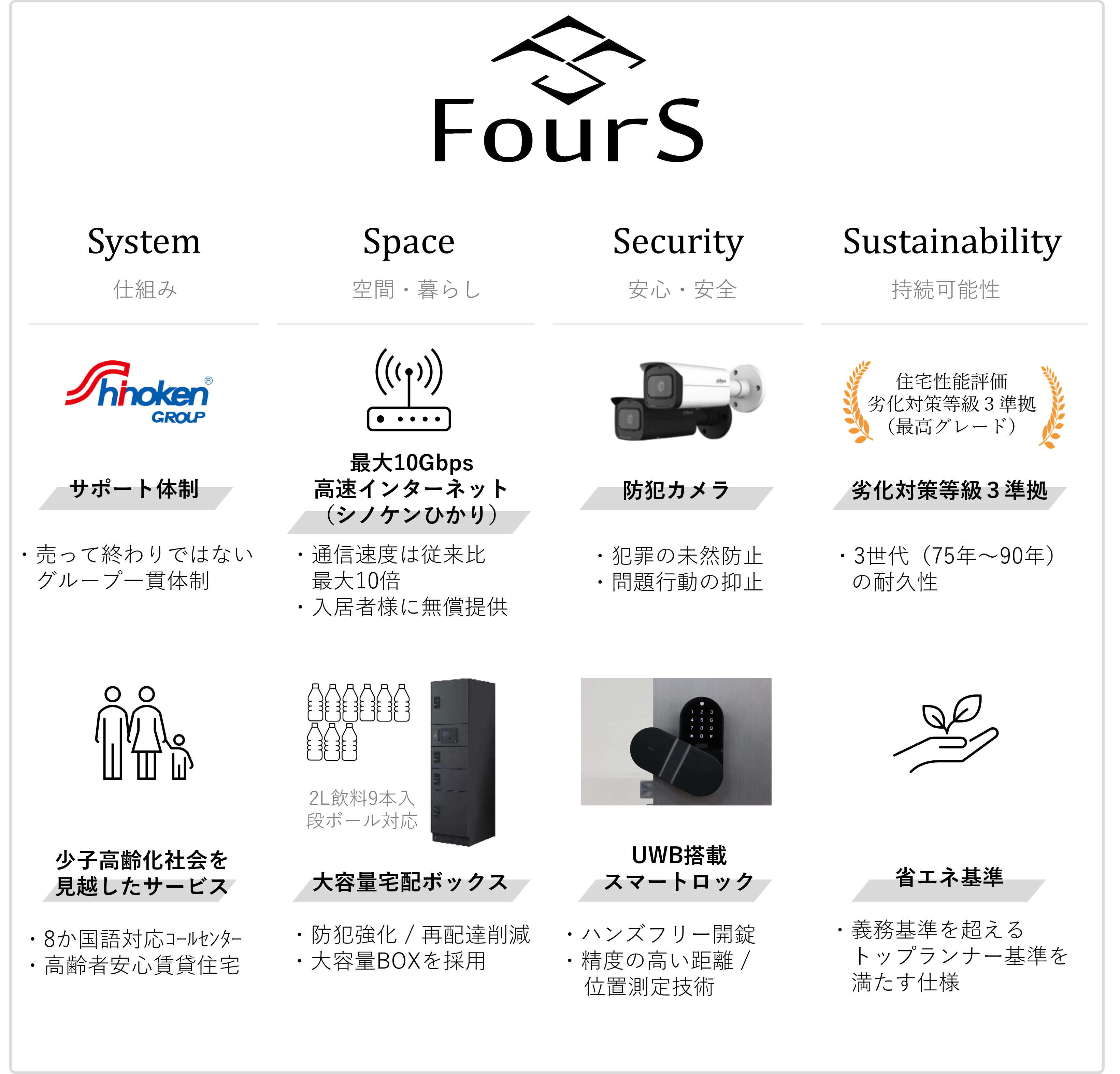 結果として空室リスクの低減、オーナー様の長期にわたる安定稼働と確かな資産づくりに貢献します。この「FourS」は、入居者様のニーズとオーナー様の安心を追及する4つの視点から構成され、当社グループの住まいづくりへの哲学が凝縮されています。