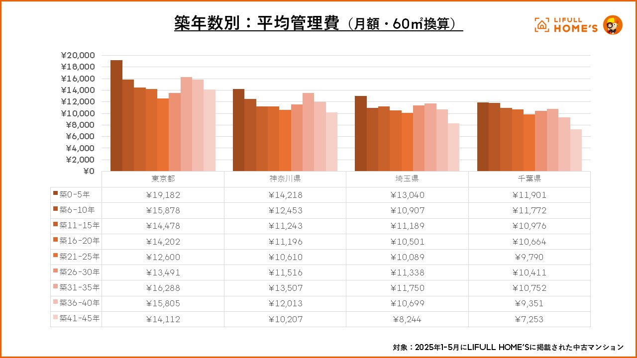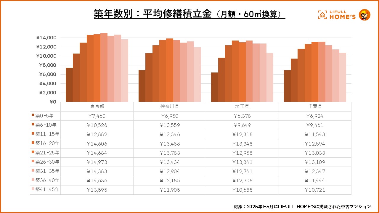2025年1-5月の間にLIFULL HOME’Sに掲載された中古マンションの平均修繕積立金と平均管理費(いずれも月額・60㎡換算)を築年数別で見てみました。