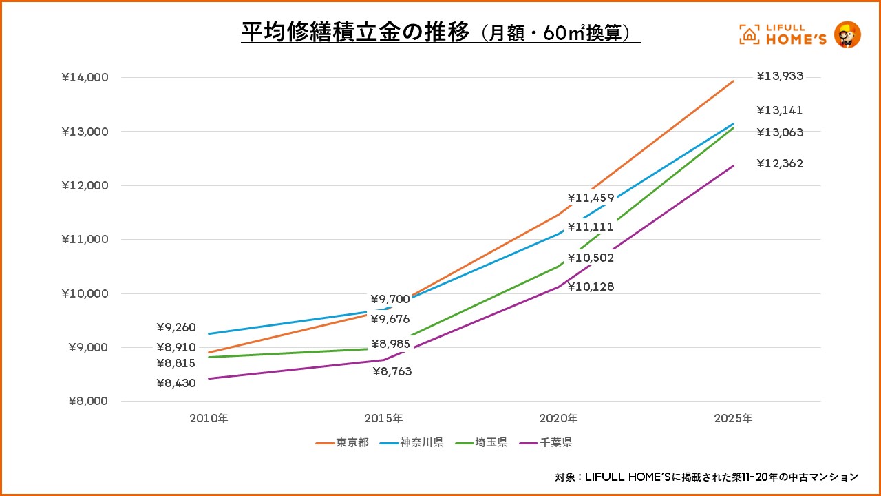 1都3県いずれにおいても漸増となっており、2025年に掲載された築11-20年物件の平均修繕積立金は15年前(2010年)と比べて月額3,881-5,023円の上昇となっています。