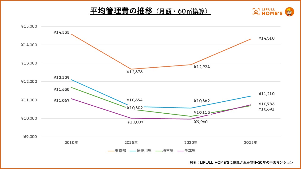 各年(2010年・2015年・2020年・2025年)にLIFULL HOME’Sに掲載された築11-20年の中古マンションの平均修繕積立金と平均管理費(いずれも月額・60㎡換算)を見てみました。