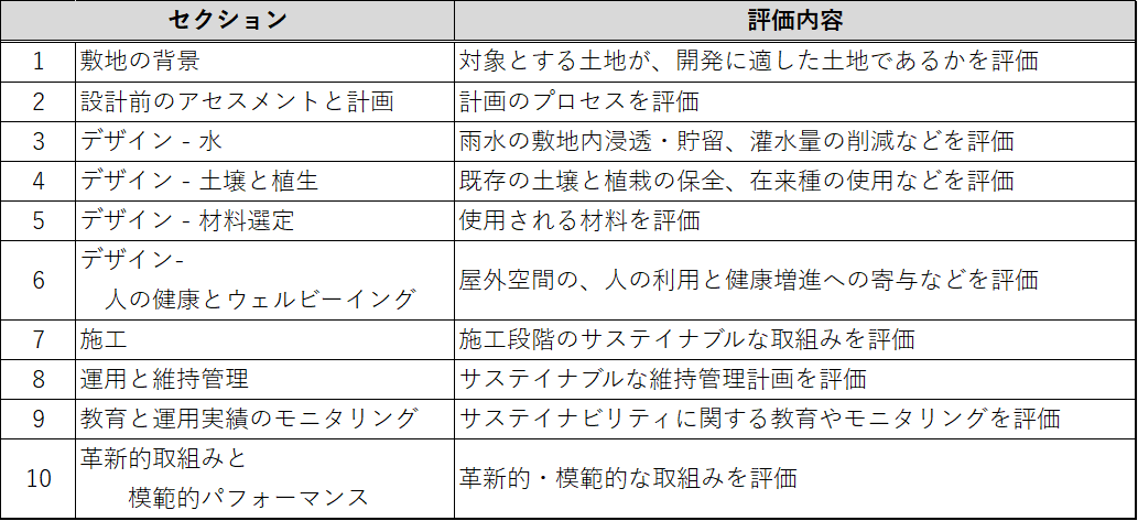 SITES®認証では10のセクション(敷地の背景、設計前のアセスメントと計画、水、土壌と植生、材料選定、人の健康とウェルビーイング、施工、運用と維持管理、教育と運用実績のモニタリング、革新的取り組みと模範的パフォーマンス)の様々な取組みが評価対象となります。