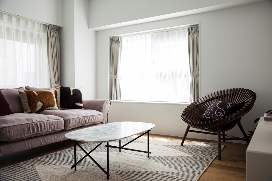 リビングは広さを活かし、中央に大人3人がゆったり座れるソファを配置。優雅でクラシカルなフォルムと広めの座面が、穏やかな時間を演出します。適度な弾力で長時間座っても疲れにくく、ドライクリーニング対応のファブリックでお子さまがいるご家庭でも安心です。白を基調とした空間には、モーブカラーのソファを主役に、スチールの黒ラインを随所に配し、全体に統一感をもたせました。アクセントとして取り入れたのは、120本の無垢材スラットで構成されたラウンジチェア。抜け感により、空間に軽やかさを加えています。