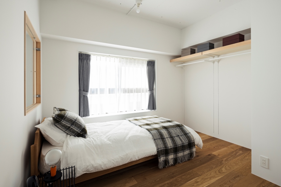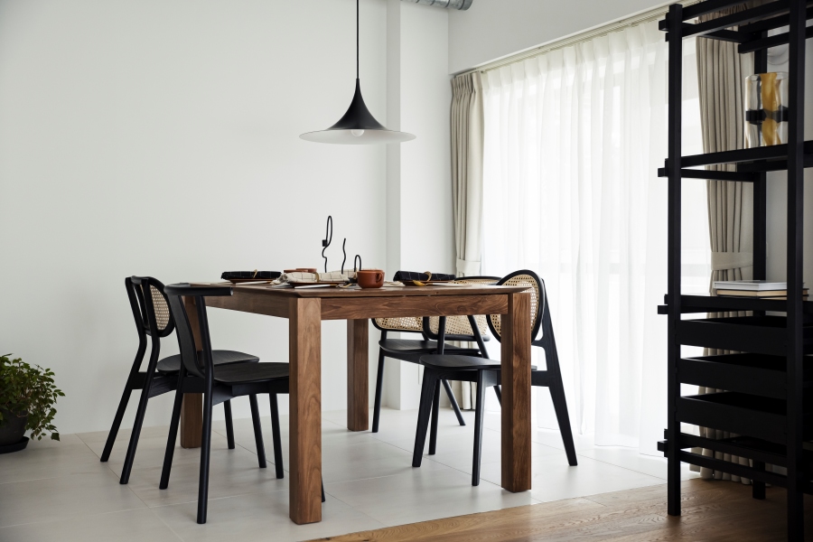 リビングとダイニングの間には、須長壇氏デザインのオープンシェルフを設置。360度使えるため、間仕切りとしても活用可能です。ダイニングには、1400mmから2200mmまで伸長可能な高機能テーブルをセレクト。来客時にも柔軟に対応できる設計です。タイの伝統的な籐編み技法と現代的デザインを融合させた、異なるデザインのチェア4脚を合わせ、The Conran Shop今季のテーマカラー「テラコッタ」をポイントで取り入れました。照明はシンプルながらデザイン性も高く、空間全体と調和しています。洋室はベッドルームとして、インテリアスタイリスト石井佳苗氏とコラボした「アン シェーカー」のベッドフレームを採用。ヘッド部分の隙間は、マットレス設置時の抜け感に配慮した高さで設計され、通気性に優れたスノコ仕様という実用性も兼ね備えています。