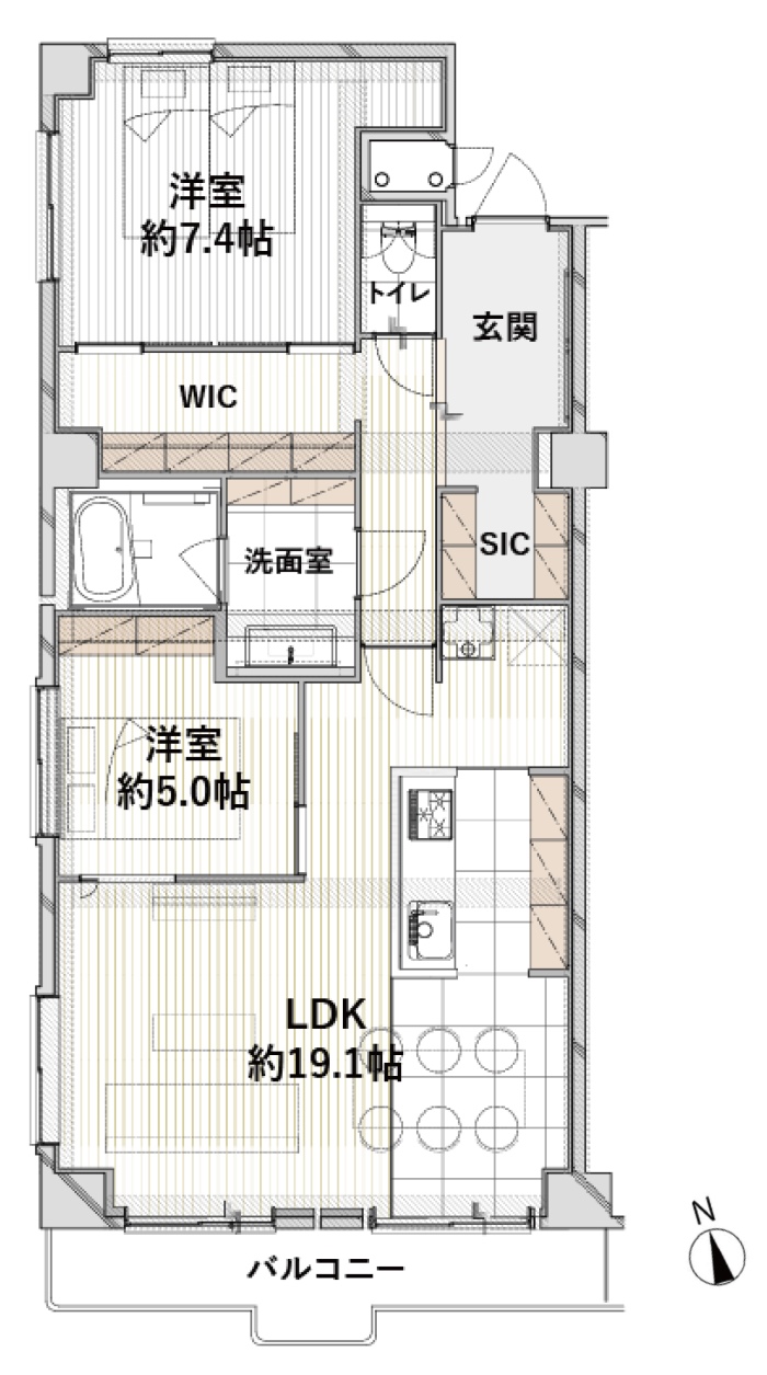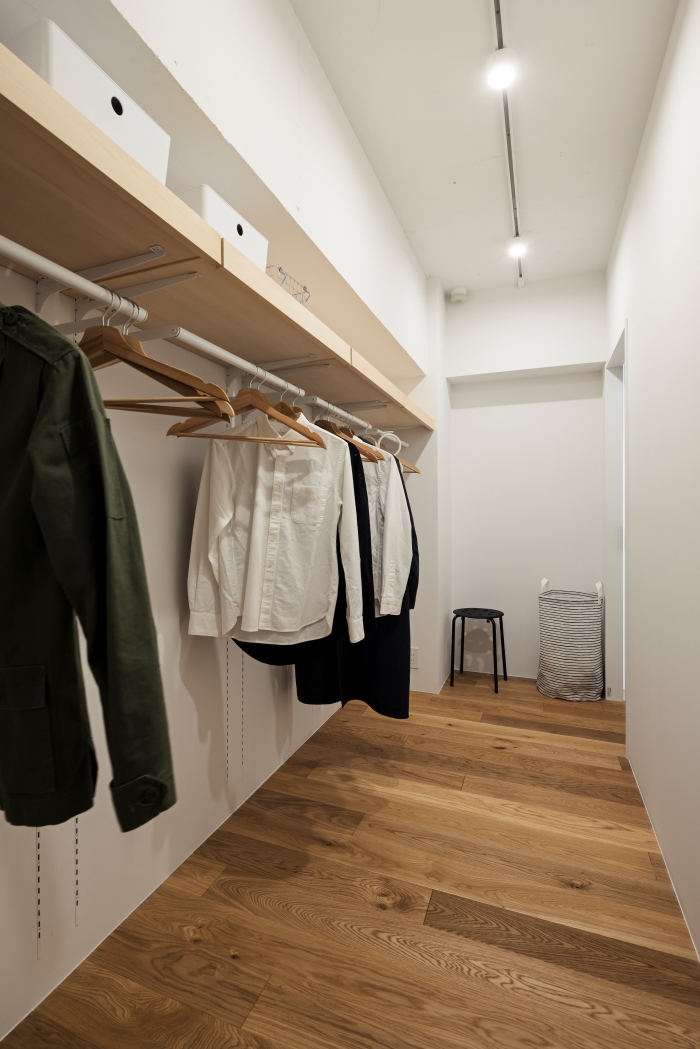 洋室は7.4帖と5.0帖の2部屋。リビング側の洋室には室内窓を設け、光と風が心地よく通る設計に。縦横で2メートルの幅があるので、ベッドの向きが横でも縦でも並べられる嬉しい設計。7.4帖の洋室は将来的に空間を仕切って使えるよう、引き戸を2箇所に設置し、ライフスタイルの変化に柔軟に対応します。洋室とLDKをつなぐ廊下にはWICを配置。ハンガーパイプや可動棚を備え、衣類から本、小物まで効率的に収納できるように設計されています。