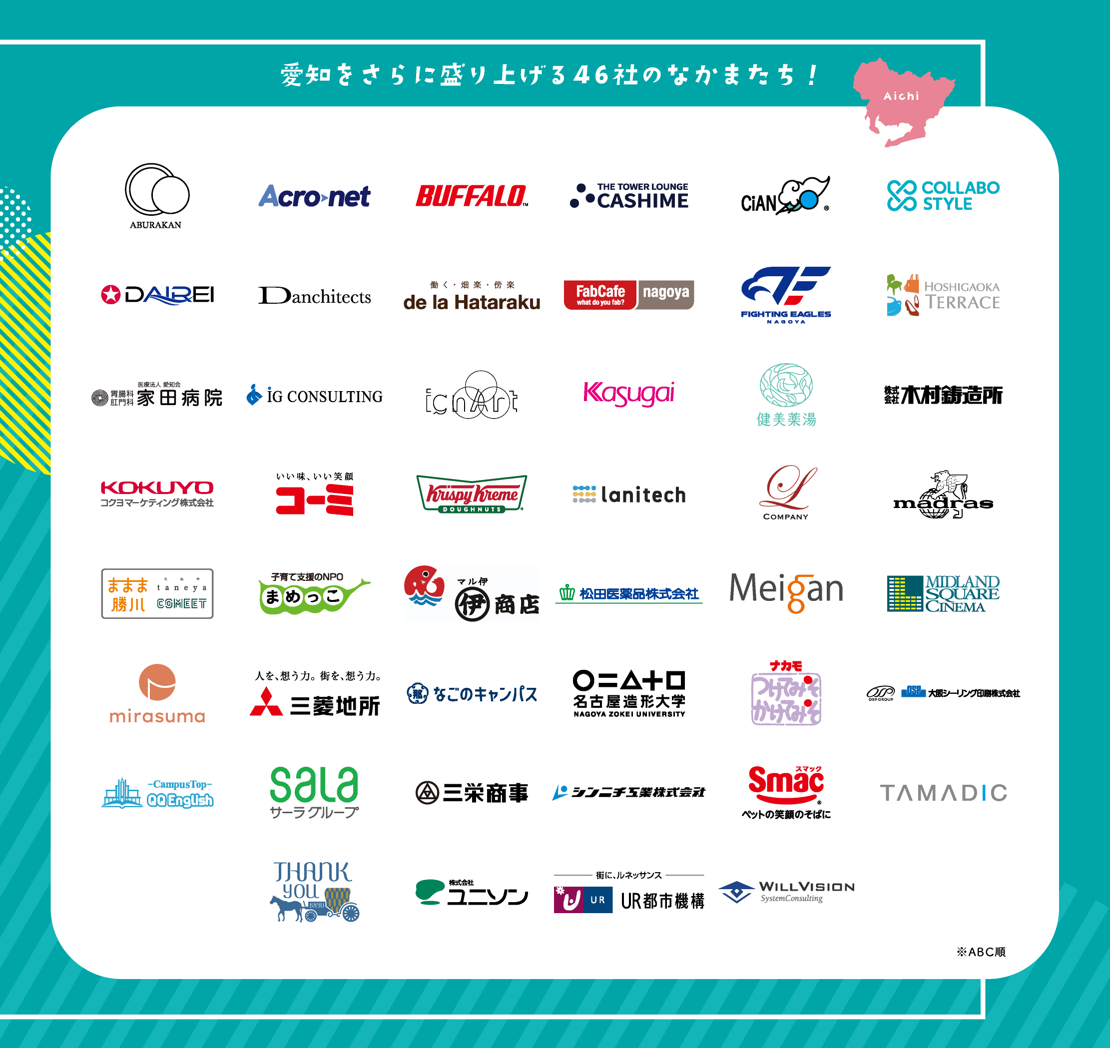 株式会社油勘、株式会社アクロネット、株式会社バッファロー、CASHIME、株式会社シアン、株式会社コラボスタイル、大冷工業株式会社、 Danchitects、株式会社de la hataraku、株式会社FabCafe Nagoya、豊通ファイティングイーグルス株式会社、東山遊園株式会社、医療法人愛知会家田病院、株式会社アイジーコンサルティング、株式会社ignArt、春日井製菓株式会社、健美薬湯株式会社、株式会社木村鋳造所、コクヨマーケティング株式会社、コーミ株式会社、クリスピー・クリーム・ドーナツ・ジャパン株式会社、lanitech合同会社、合同会社ライラ・カンパニー、マドラス株式会社、勝川エリア・アセット・マネジメント株式会社、認定NPO法人子育て支援のNPOまめっこ、マル伊商店株式会社、松田医薬品株式会社、名古屋眼鏡株式会社、中日本興業株式会社/ミッドランドスクエア シネマ、株式会社mirasuma、三菱地所株式会社、なごのキャンパス、名古屋造形大学、ナカモ株式会社、大阪シーリング印刷株式会社、株式会社QQ English、サーラグループ、三栄商事、シンニチ工業株式会社、株式会社スマック、株式会社タマディック、株式会社サンテフレスコ、株式会社ユニソン、独立行政法人都市再生機構、株式会社ウィルビジョン
