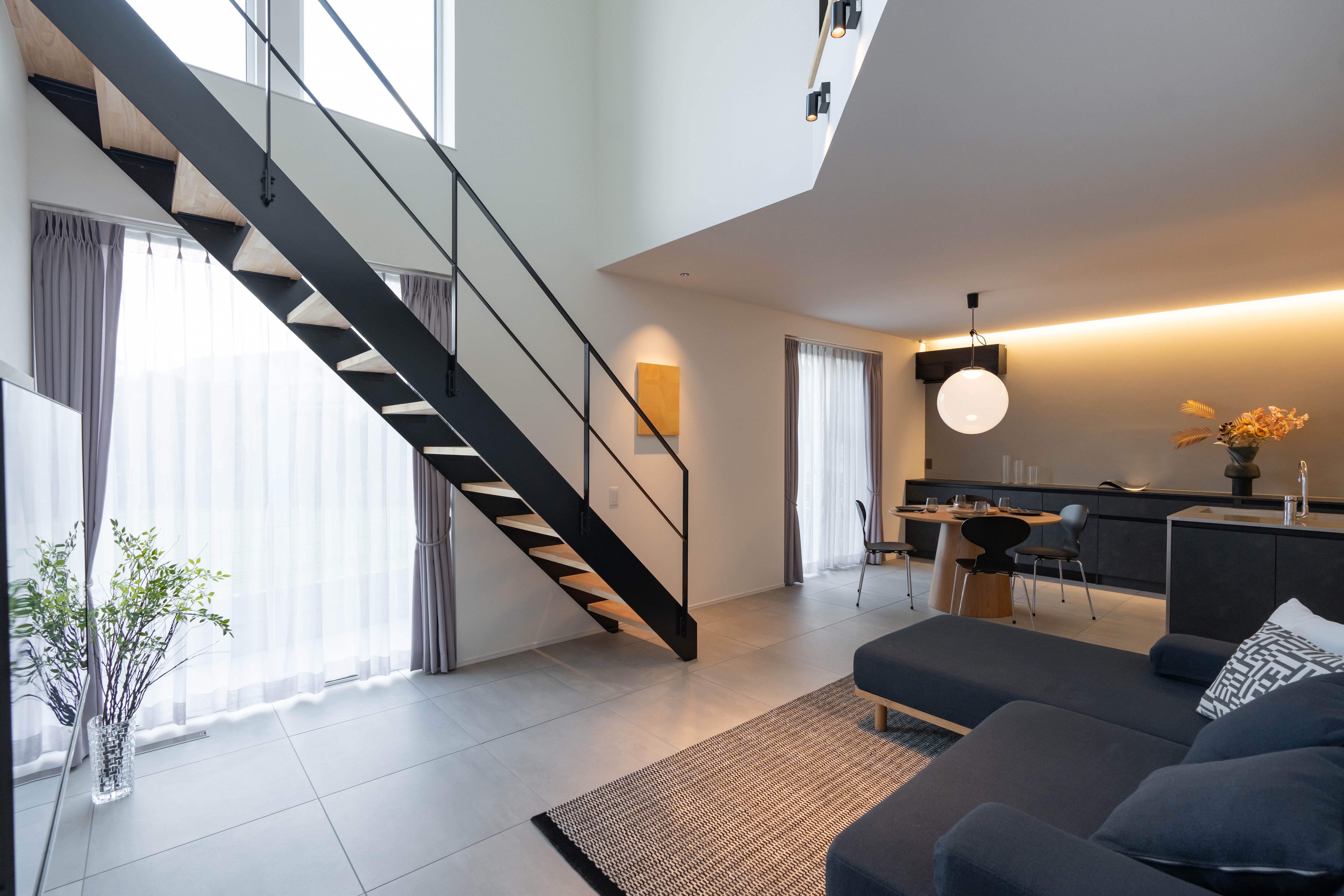 シンプルで飽きのこない「ホテルモダン」な外観と内装。グレーを基調とした無機質な雰囲気に、間接照明や開放的な吹抜けが映える上質な空間。