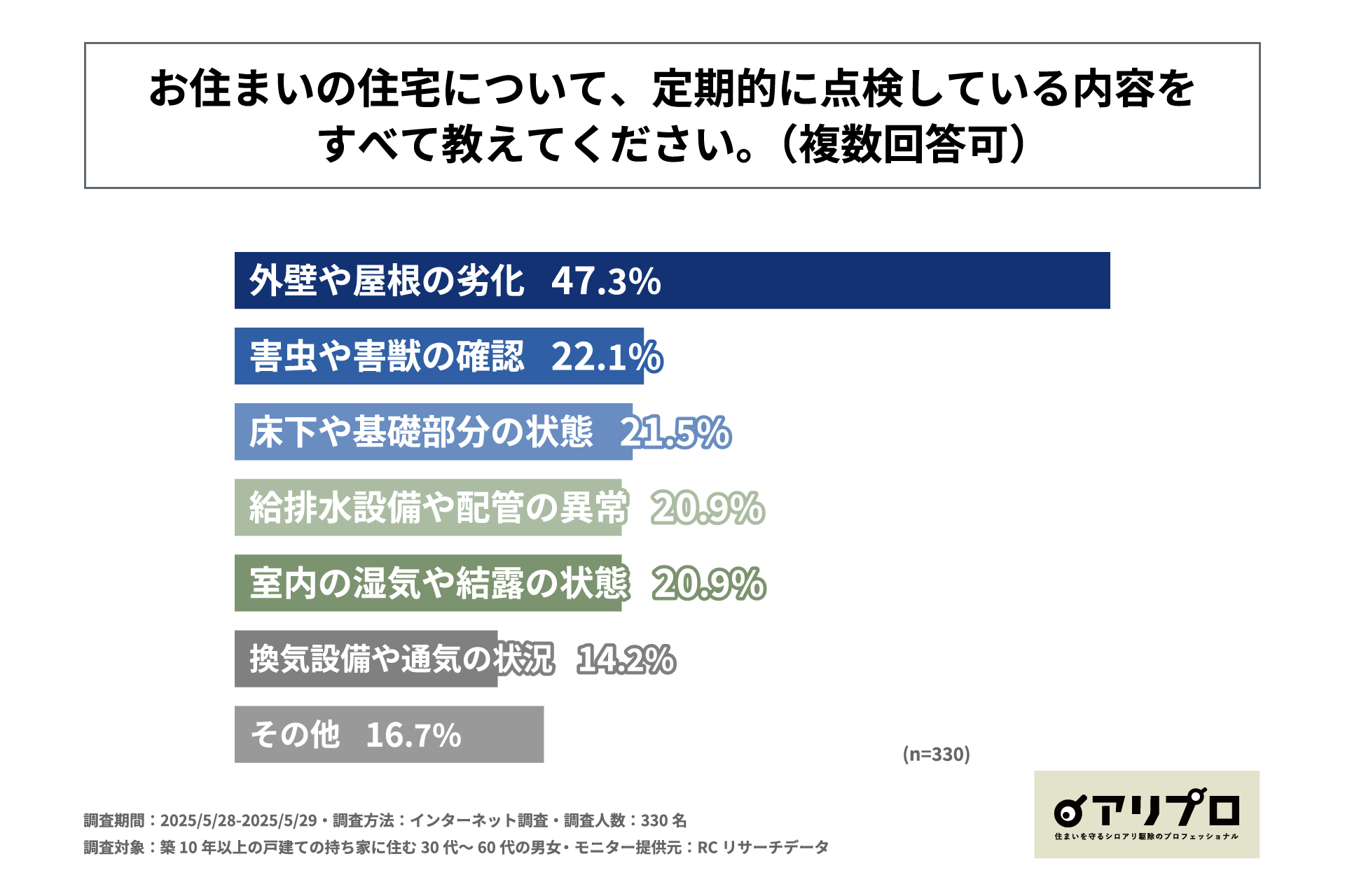 住居について定期点検している内容のトップ3は、1位「外壁や屋根の劣化」、2位「害虫や害獣の確認」、3位「床下や基礎部分の状態」