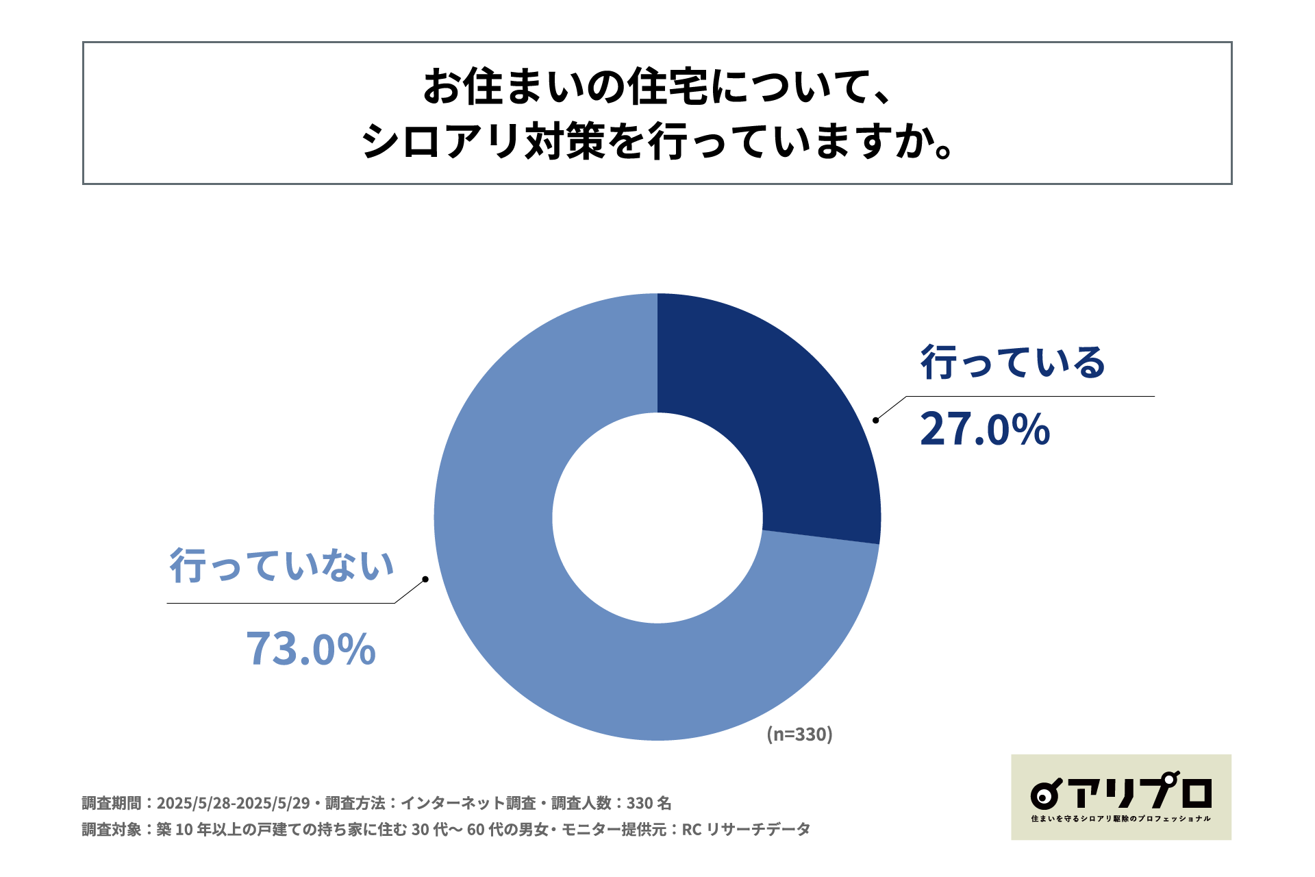 続いて、「お住まいの住宅について、シロアリ対策を行っているか」を尋ねる設問への回答では、「行っていない」が73.0%、「行っている」が27.0%という結果になりました。この結果から、築10年以上の戸建ての持ち家に住む30代~60代の男女の約3割が、住居のシロアリ対策を行っていることが判明しました。