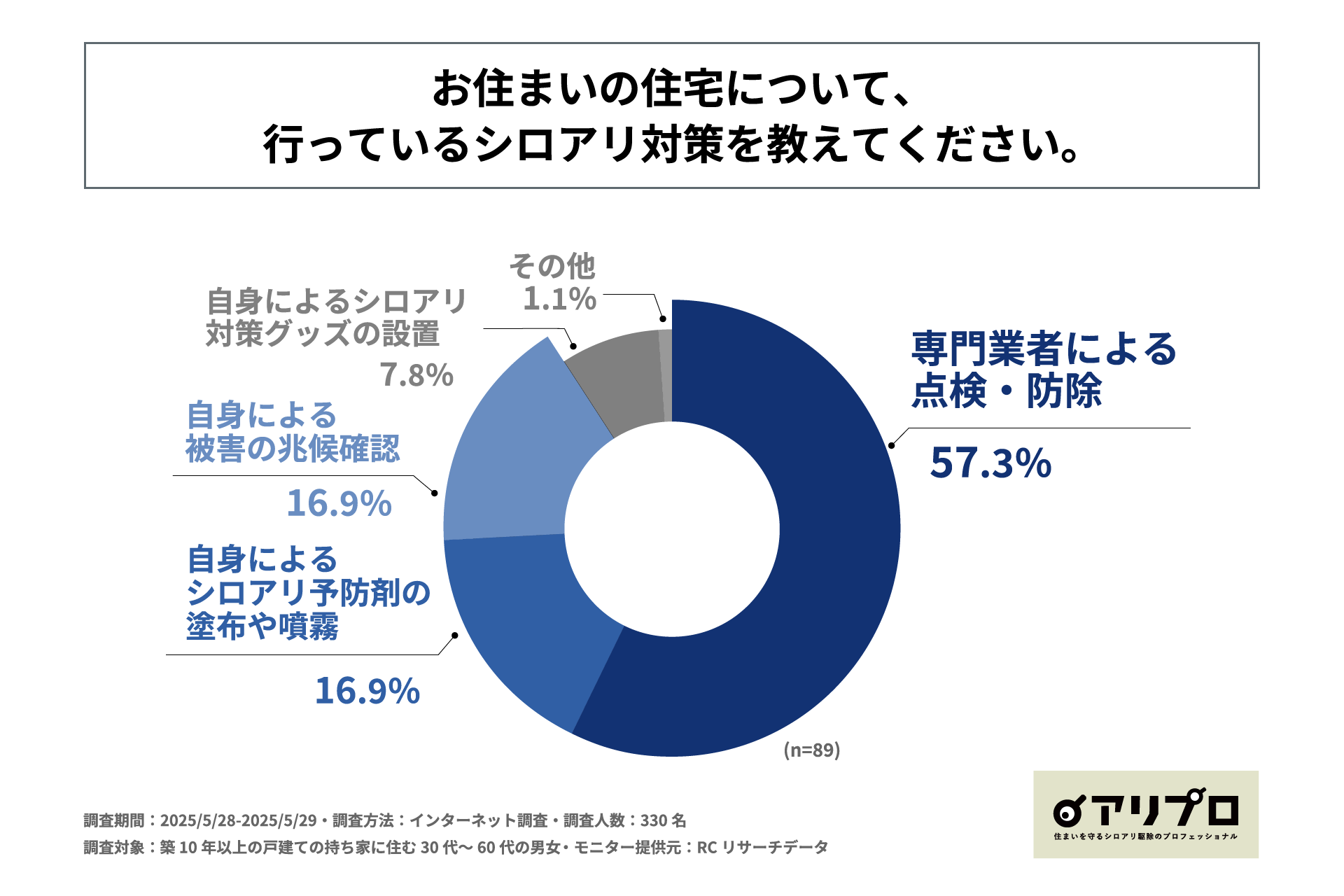 次に、住居のシロアリ対策を行っている人を対象に「お住まいの住宅について、行っているシロアリ対策」を尋ねる設問への回答では、1位が「専門業者による点検・防除」で57.3%、2位が同率で「自身によるシロアリ予防剤の塗布や噴霧」と「自身による被害の兆候確認」で16.9%という結果になりました。この結果から、住居のシロアリ対策をしている人の約6割が行っているシロアリ対策は、「専門業者による点検・防除」であることが明らかになりました。