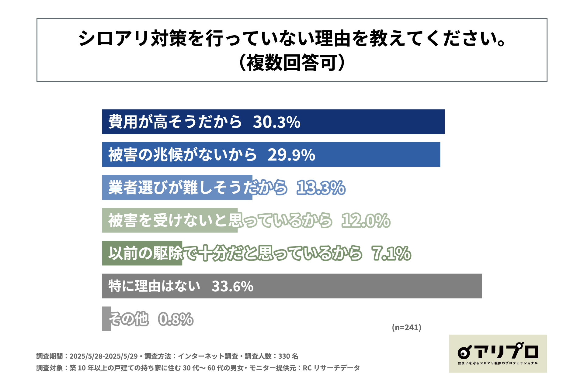 また、住居のシロアリ対策を行っていない人を対象に「シロアリ対策を行っていない理由」を尋ねる設問への回答では、1位が「特に理由はない」で33.6%、2位が「費用が高そうだから」で30.3%、3位が「被害の兆候がないから」で29.9%という結果になりました。この結果から、住居のシロアリ対策を行っていない主な理由は、「特に理由はない」が多いものの、「費用が高そうだから」や「被害の兆候がないから」が上位に挙がることがわかりました。