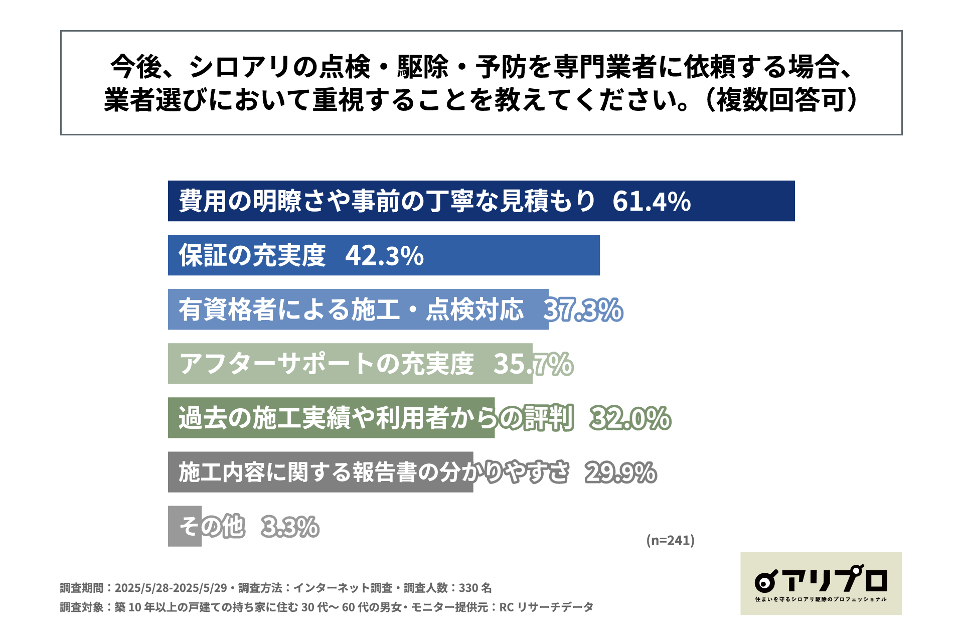 調査の最後、住居のシロアリ対策を行っていない人を対象に「今後、シロアリの点検・駆除・予防を専門業者に依頼する場合、業者選びにおいて重視すること」を尋ねる設問への回答では、1位が「費用の明瞭さや事前の丁寧な見積もり」で61.4%、2位が「保証の充実度」で42.3%、3位が「有資格者による施工・点検対応」で37.3%という結果になりました。この結果から、住居のシロアリ対策を行っていない人が、今後シロアリの点検・駆除・予防を専門業者に依頼する場合、業者選びにおいて主に重視することは「費用の明瞭さや事前の丁寧な見積もり」や「保証の充実度」であることが明らかになりました。