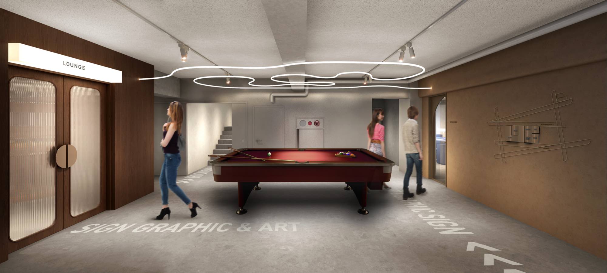 エントランスからラウンジ、ワーキングスペース、屋上、裏口の隠れ家BARへと続く通路には、“光のライン”が続き、帰宅の途中に立ち寄るその時間は、人と語らい、明日を整えるひとときに。住まう人が自分のリズムでONとOFFを切り替え、心身をリセットし、次なる自分へ向かう場所を目指します。