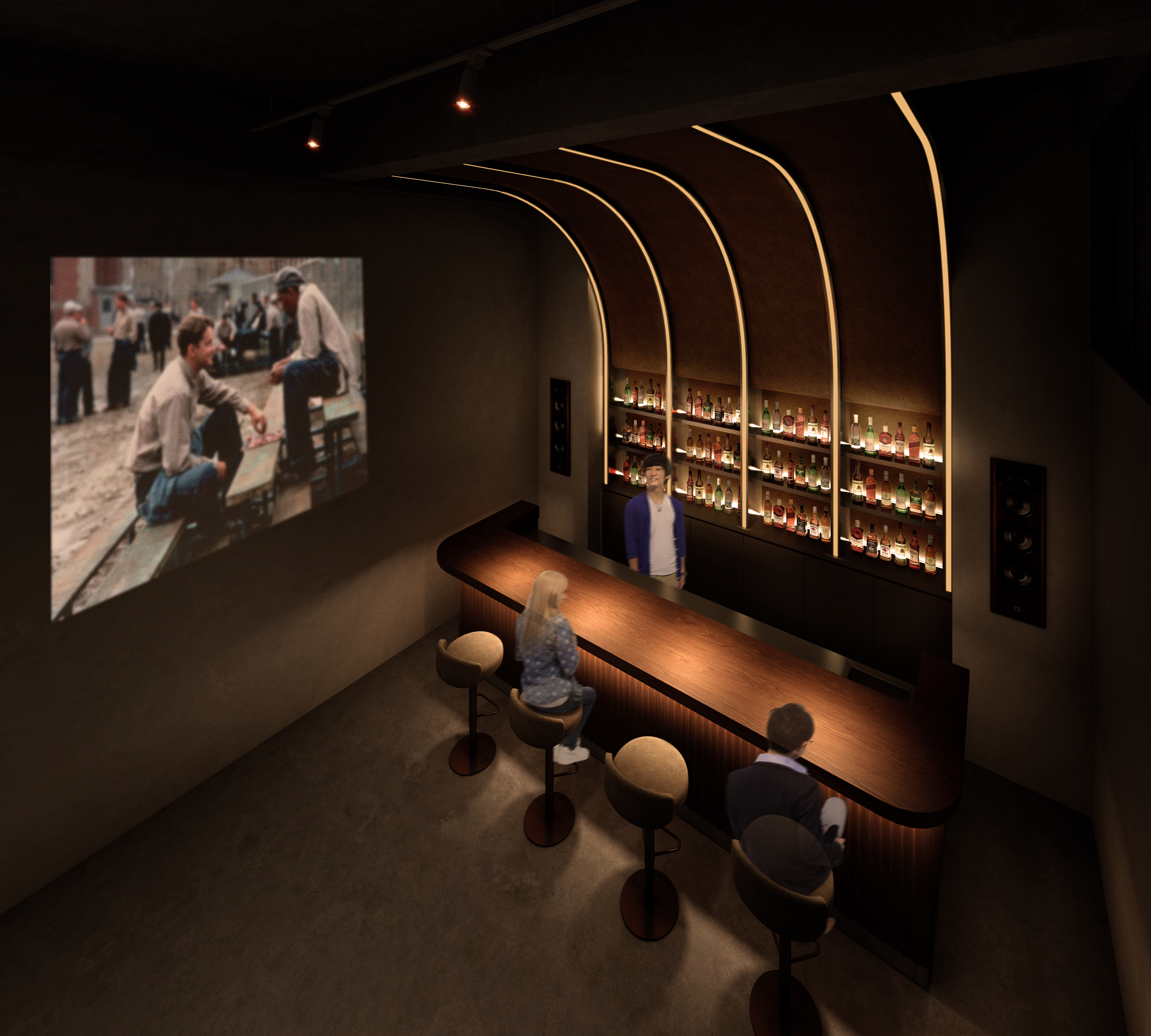 さらに、2フロア分の吹き抜けの空間の壁に照らし出される大型スクリーンに映像を映してスポーツ観戦などが楽しめる空間になっています。仕事終わりに軽く一杯、非日常を感じられる秘密基地のような空間が待っています。
