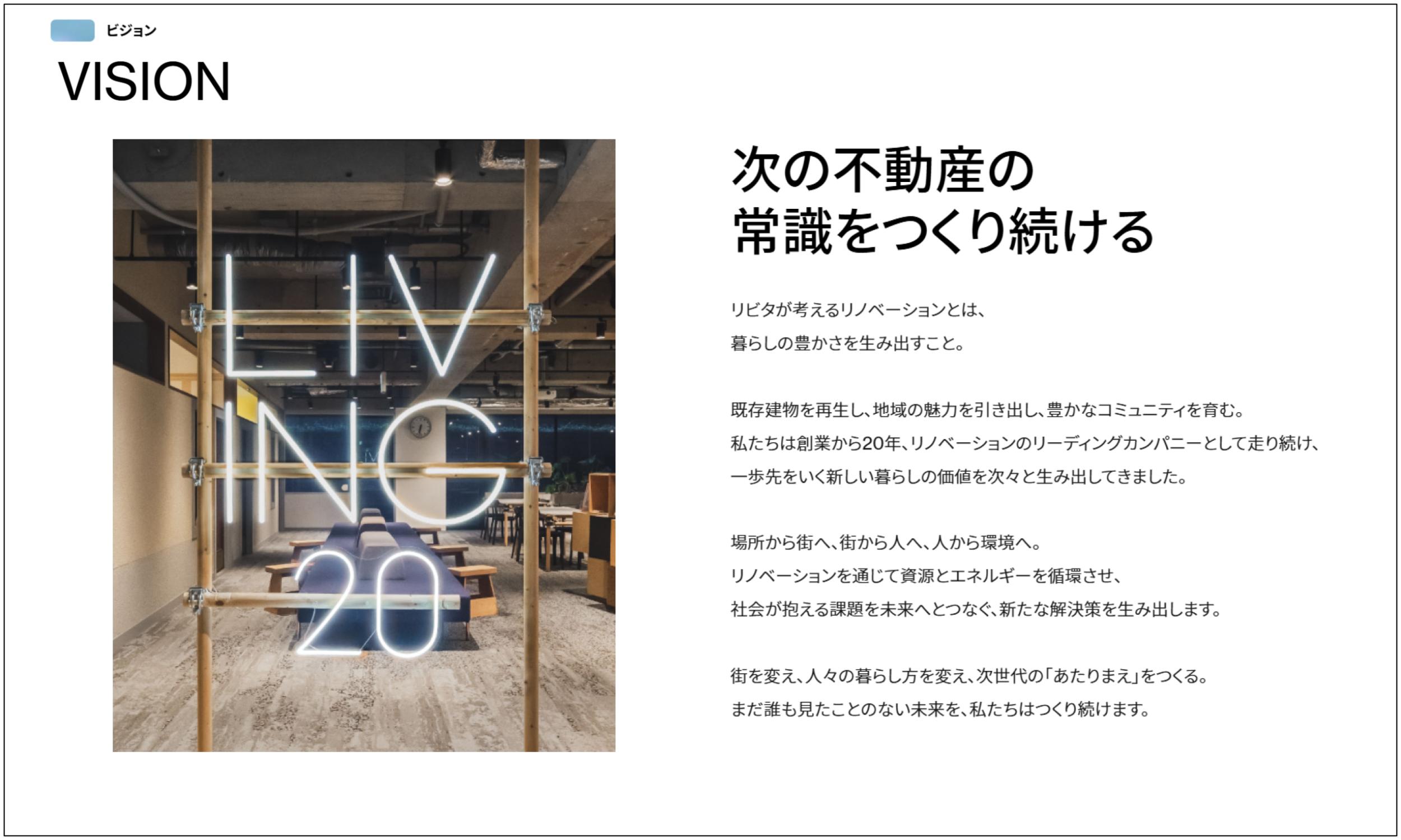 リビタが創業以来大切にしている価値観や社会に対して果たしたい役割を、言葉とビジュアルの両面から伝えるサイトにしています。ミッションの実現にむけて掲げるビジョン「次の不動産の常識をつくり続ける」は、創業10周年の際に制定されたものであり、20周年を迎えた今もなお、リビタの軸として息づいています。