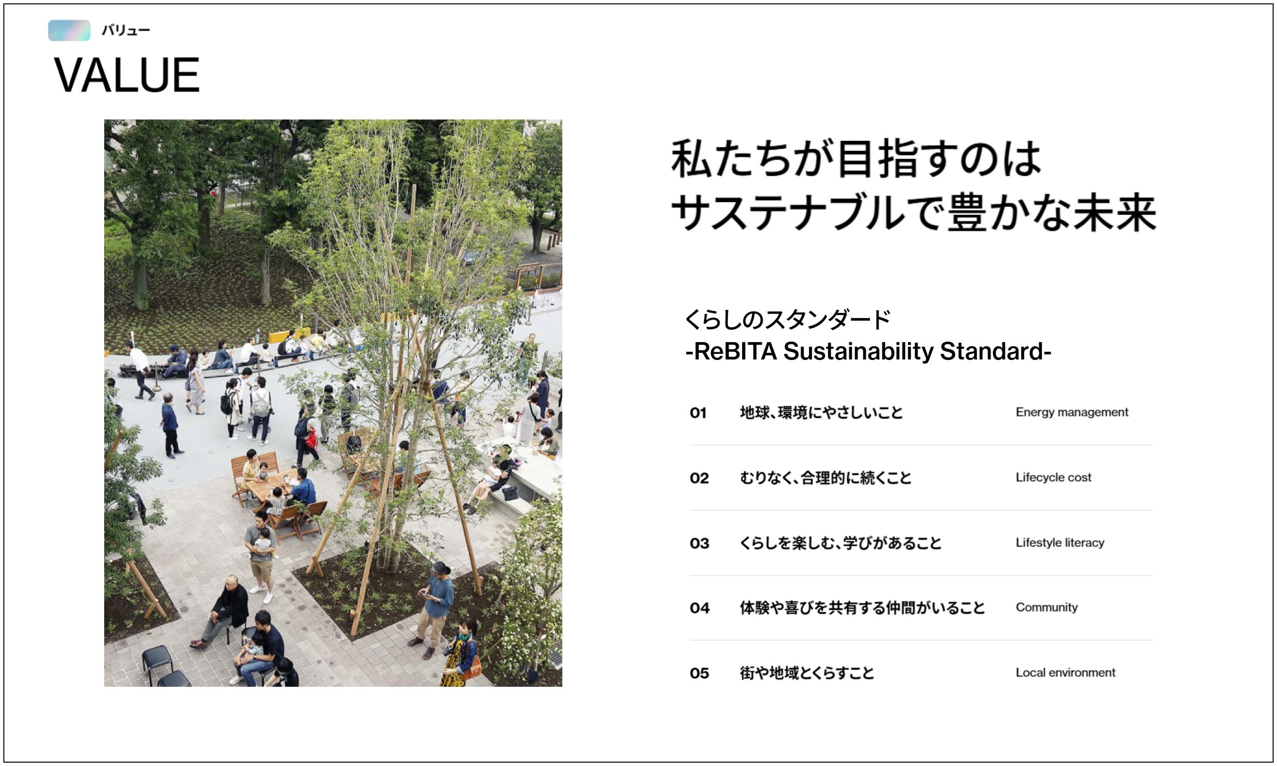 また、一歩先の当たり前を価値づくりの基準として示した「くらしのスタンダード-ReBITA SustainabilityStandard-(読み:リビタ サステイナビリティ スタンダード)」も、5つの視点ごとに表現を整え、リビタの考え方がより伝わりやすくなるよう可視化を図りました。