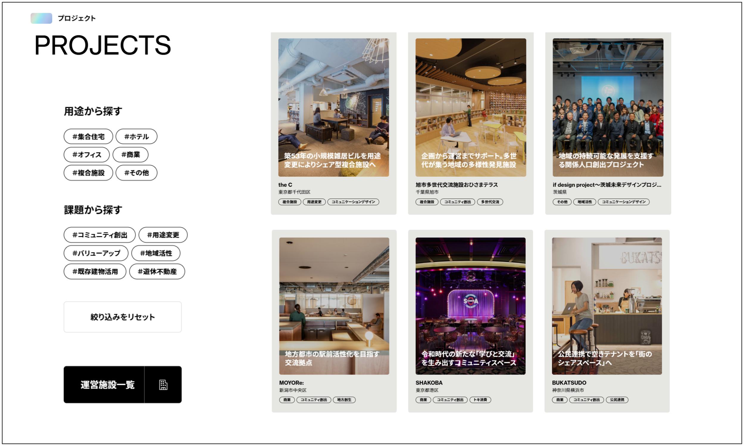 これまでにグッドデザイン賞やリノベーション・オブ・ザ・イヤーなどでも評価されたプロジェクトを、ハード(建築・建物)とソフト(運営・仕組み)の両面から紹介しています。社会課題やクライアントの事業課題と向き合い、リビタならではの視点で導き出したソリューションを、わかりやすくまとめています。