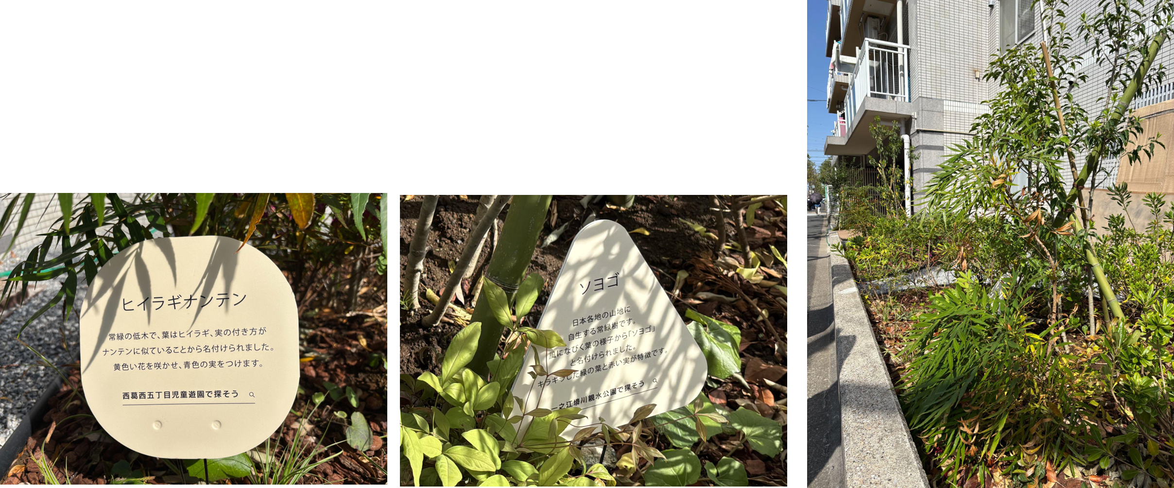 外構や敷地内を緑化し、近隣の公園をモチーフとしたマイクロパークを点在させました。近隣の公園にある樹木をメインツリーとし、サインを設置することで、地域の公園散策に誘う仕掛けとしました。ウェルビーイングな暮らしに寄与することを意図しています。