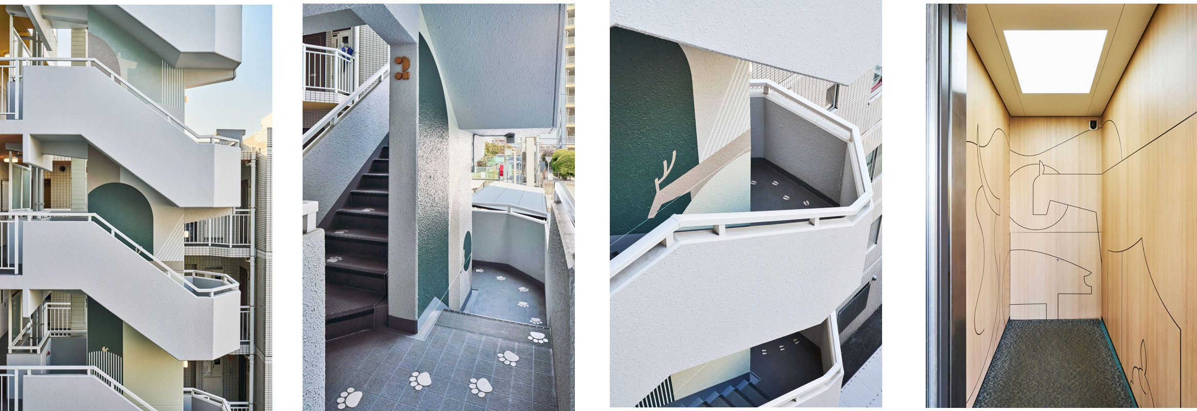 エレベーターや階段室には、子供が楽しめる動物のモチーフを用いたグラフィックウォールを設置。床面に配置された動物の足跡をたどることで階段の昇り降りが楽しく、健康的で環境に配慮した暮らしへの第一歩になることを目指しました。