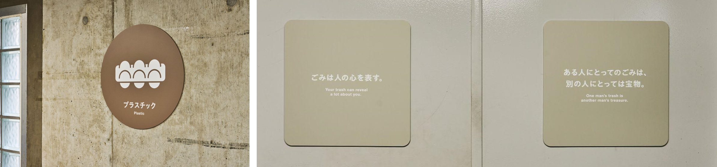 ごみ置き場には、グラフィックで分別やごみ削減、美化を促すメッセージを設置。自然とサステナビリティを意識する仕掛けとしました。