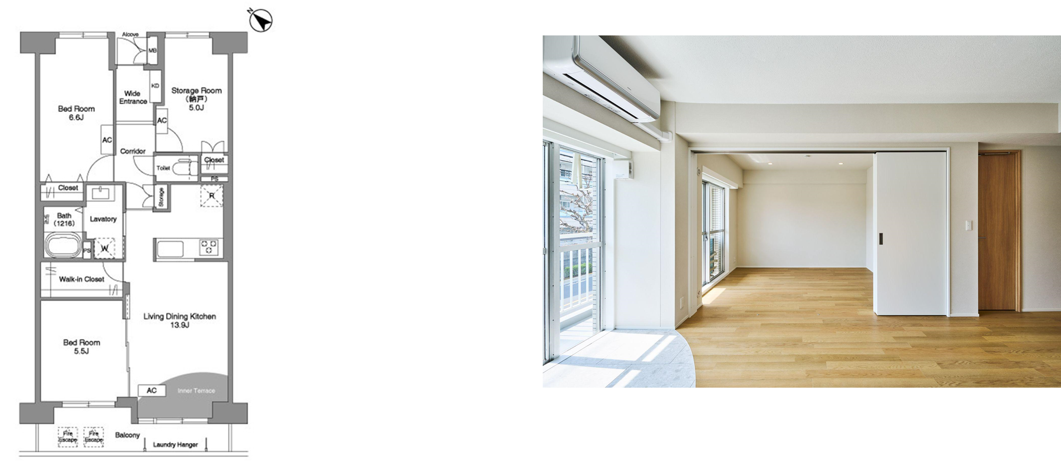 本プロジェクトは東急不動産が事業主、リノベるがプロジェクトマネジメントおよび総合企画、設計・監理・施工を担当し、東急不動産が保有する築34年、約3割が空室だった賃貸マンションをリノベーションし、収益の改善を図ったものです。リノベーション前に比べ平均35%賃料を改善、周辺の築浅マンション同等の賃料水準を実現しています。