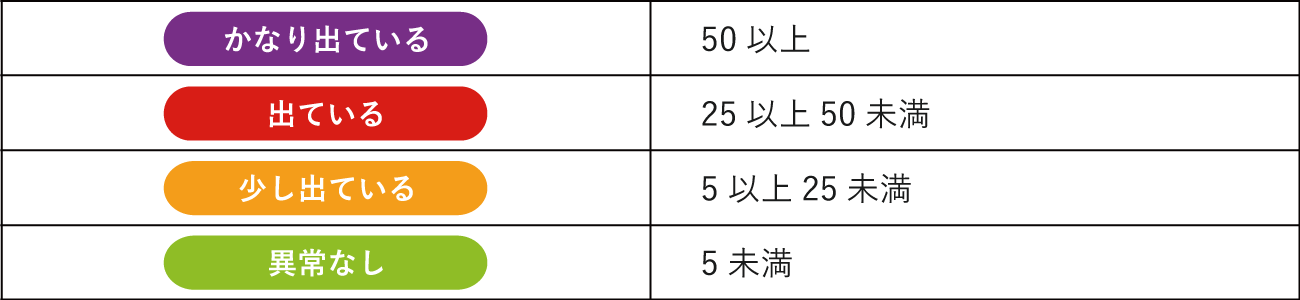 凡例は下表のとおりで、お住まいの地域の指数が25以上の場合は、ハチ被害のお問い合わせが相次いで発生している状況です。