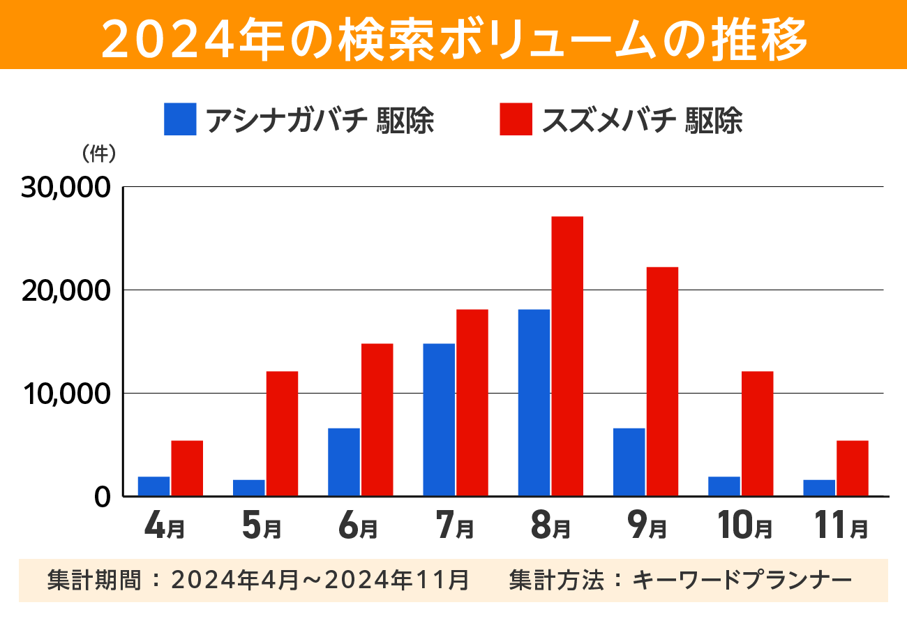 「スズメバチ 駆除」は「アシナガバチ 駆除」よりも全体的に多く検索されています。