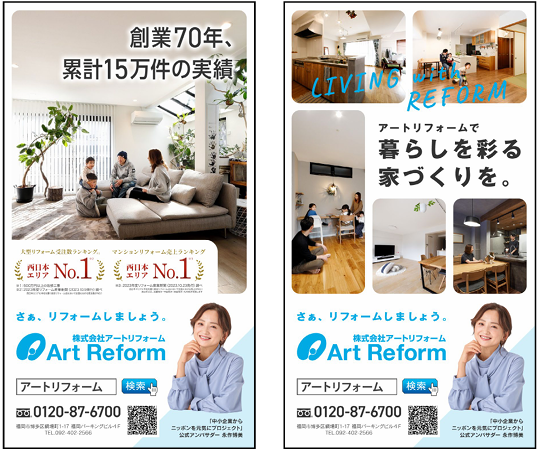 アートリフォームでは、今回の広告放映を皮切りに、福岡市内でのブランド浸透を進めてまいります。今後も地域に根ざした活動や情報発信を強化し、暮らしに寄り添うパートナーとして、福岡エリアの住まいの課題解決に貢献してまいります。