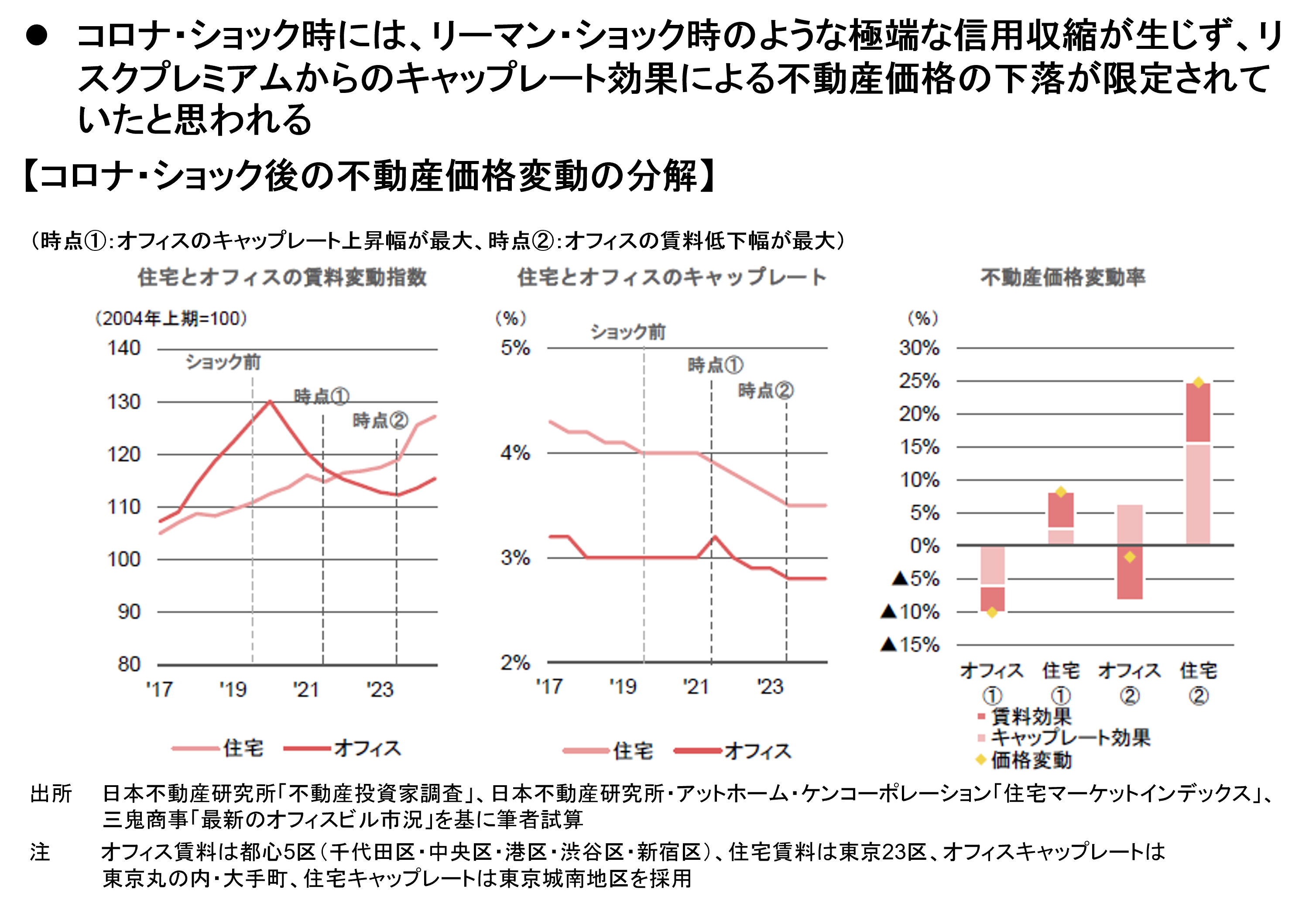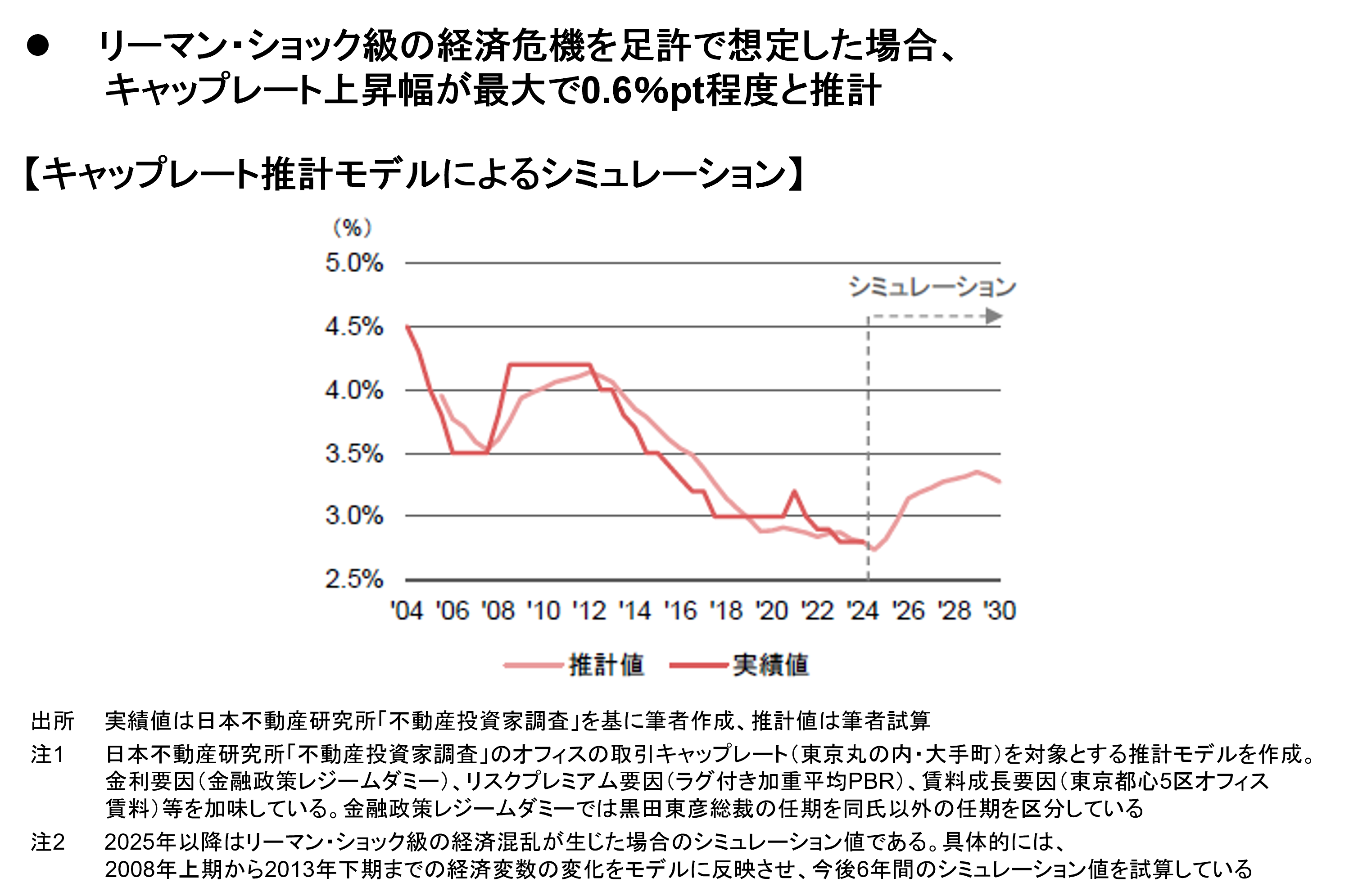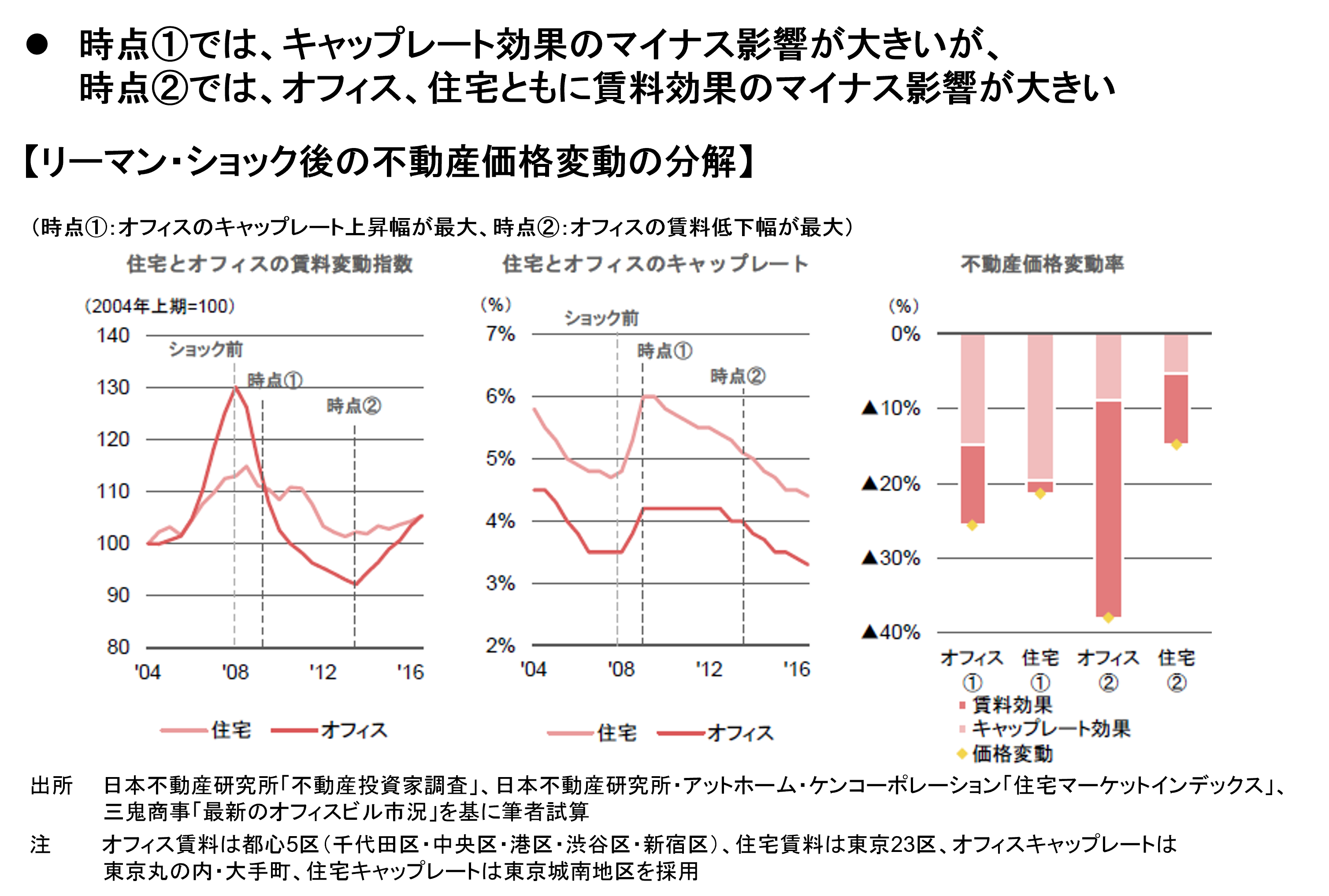 •  リーマン・ショック級の経済危機を足許で想定した場合、その直後で▲27%、賃料への経済環境変化反映後で▲40%の都心オフィス価格低下を想定