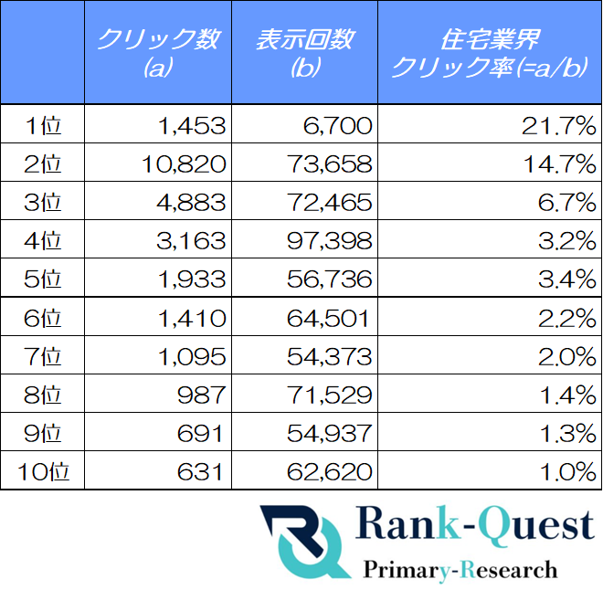 【SEO対策】で検索結果1位(注1)を獲得した実績を持つランクエスト(https://rank-quest.jp/column/column/how-to-seo/ )は、2025年5月に住宅業界のクライアントサイトを対象とし「検索順位別クリック率(CTR)」の調査を実施しました。