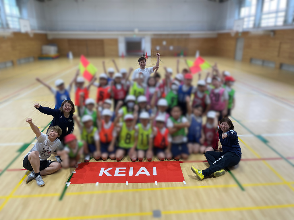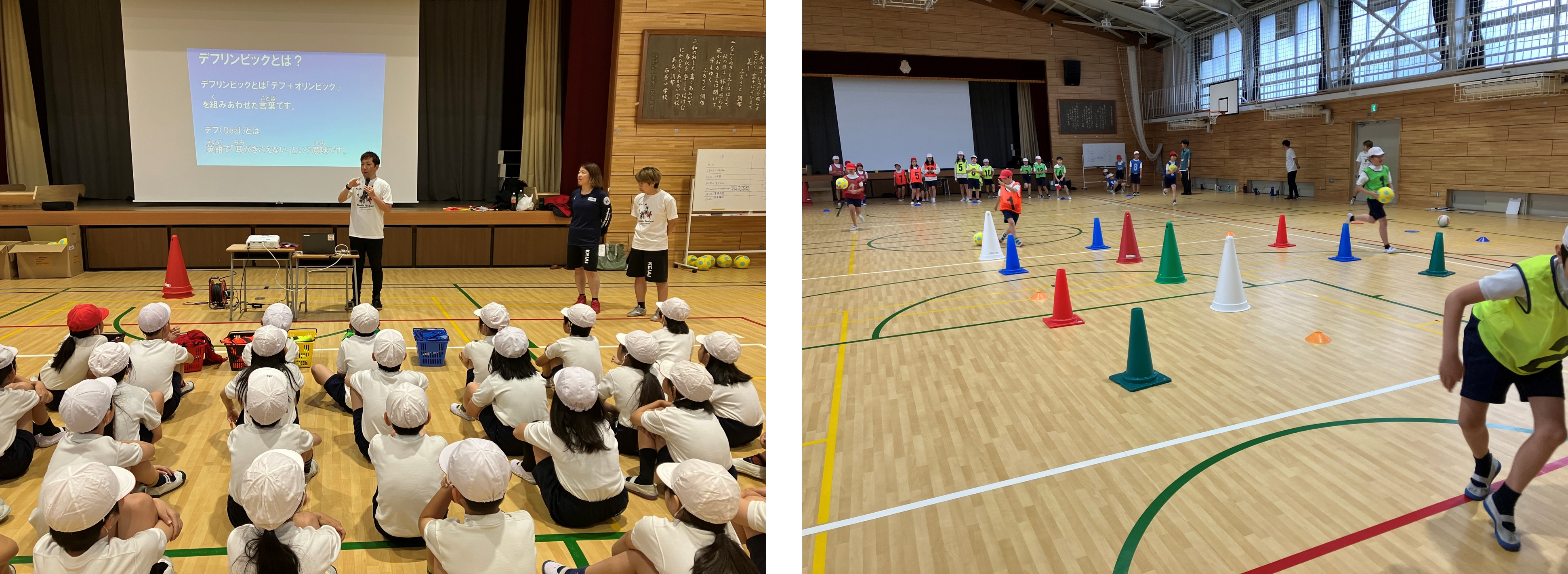 昨年度に引き続き今回の出前授業でも、デフ(ろう者)フットサルを実施しました。「デフ」とは英語で「deaf(聞こえない人、聞こえにくい人)」という意味で、デフフットサルとは、聴覚障がい者のフットサルです。競技中は補聴器を外すことが義務付けられていることから「音のないフットサル」の愛称で呼ばれています。ピッチ上ではアイコンタクトや手話でコミュニケーションをとっています。ルールは健常者のフットサルと変わらず、唯一違うのは主審も旗を持っており、笛と旗でプレーに対して合図する点です。