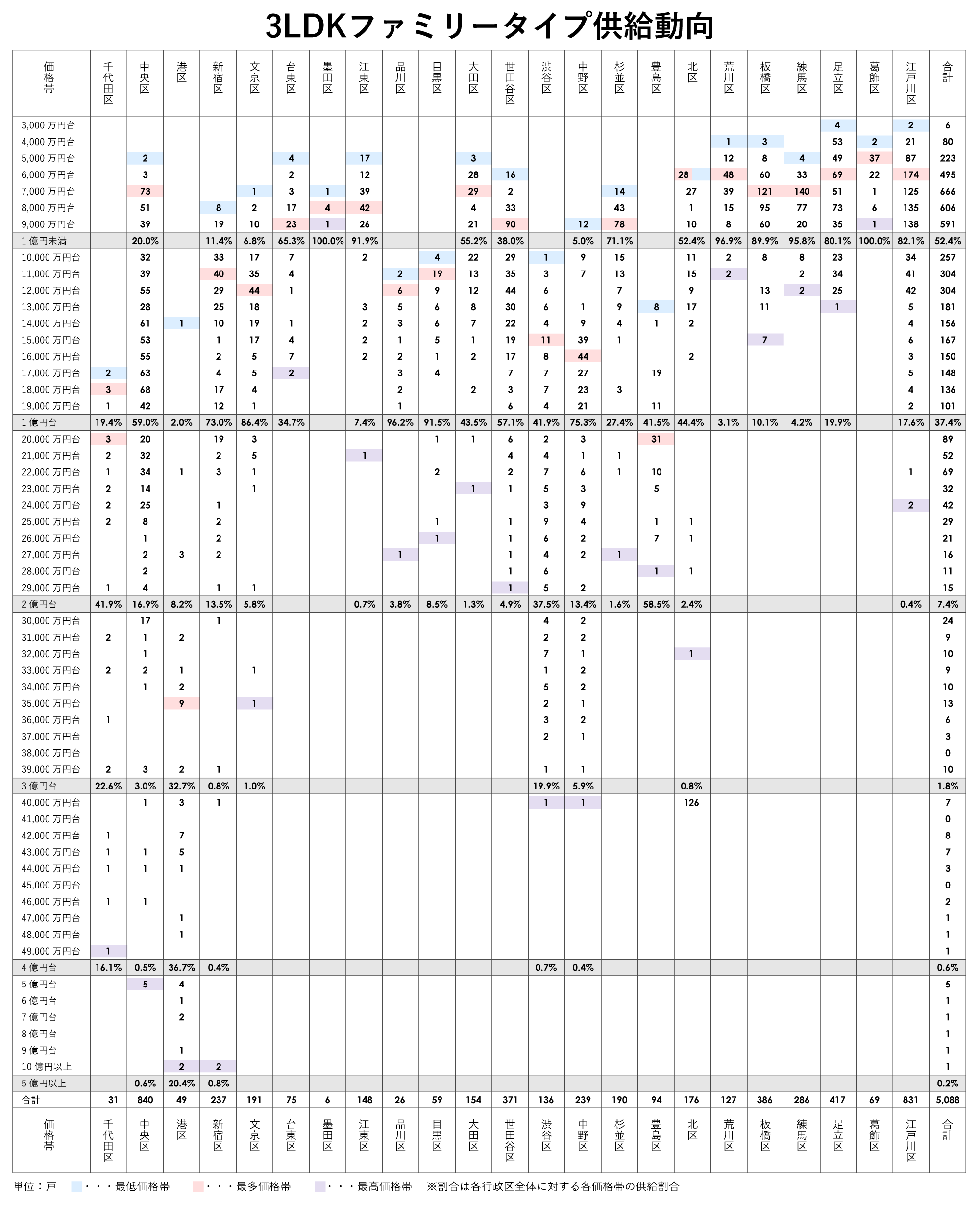 また23区のうちの殆どの区で1億円以上の住戸が分譲され1億円以上住戸の供給がなかったのは墨田区と葛飾区の2区のみ、千代田区、港区、品川区、目黒区、渋谷区、豊島区の6区は、3LDKタイプの最低価格が1億円を上回りました。