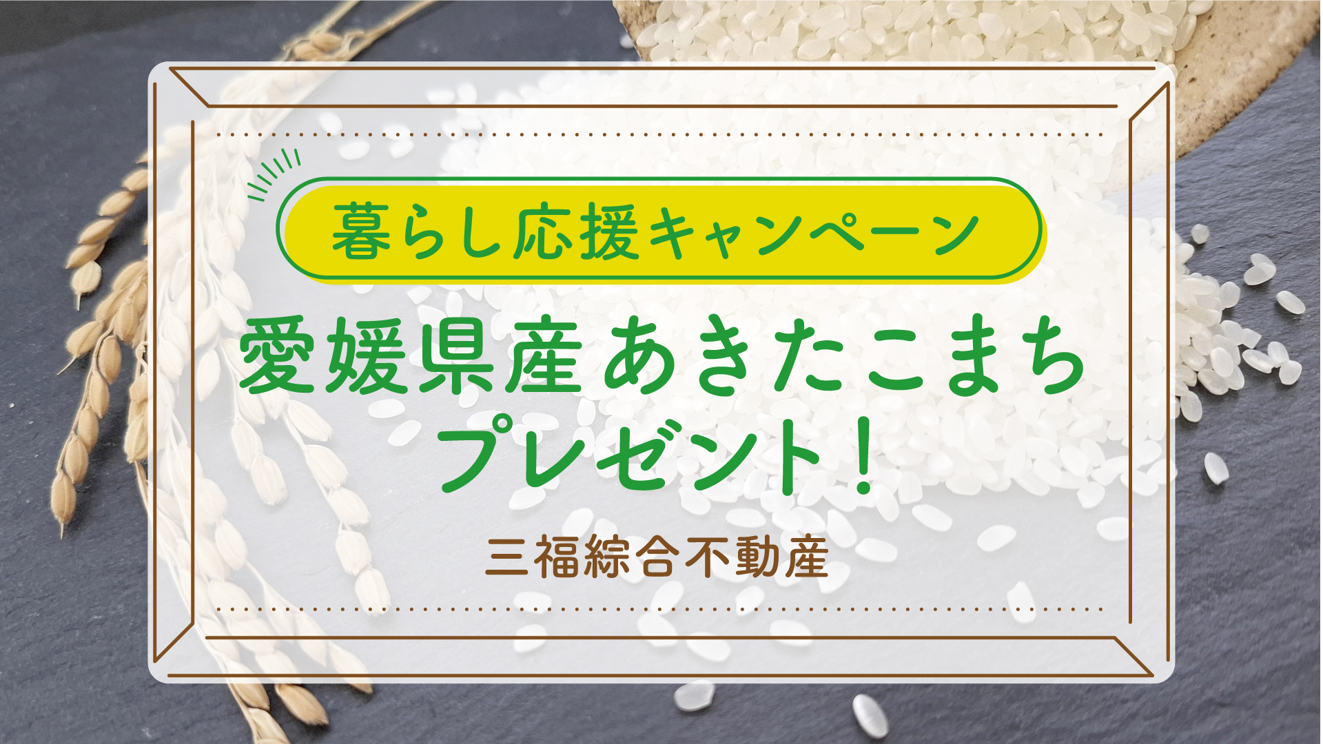 愛媛県松山市でアパマンショップ加盟店3店舗を展開する株式会社三福綜合不動産(代表取締役社長:中矢 孝則)は、地域の皆さまの暮らしを応援とする企画として、ご来店いただいたすべてのお客様に「愛媛県産あきたこまち2合(約300g)」をプレゼントする「暮らし応援キャンペーン」を開始しました。
