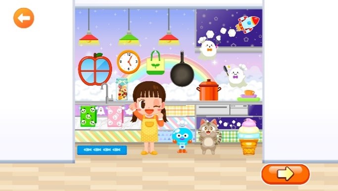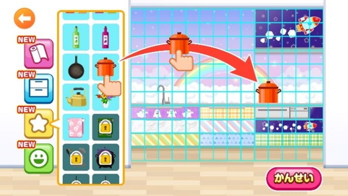 ホーローシステムキッチンを自由に飾り付けて、自分好みのオリジナルキッチンをデザインするゲームです。「キャビネットの色や柄」「好きなアイテム」を選択し、自由にデコレーションしてキッチン全体を完成させます。完成したキッチンは、タイトル画面に表示されるため、次に開いた時に前回作ったキッチンを振り返って楽しむことができます。