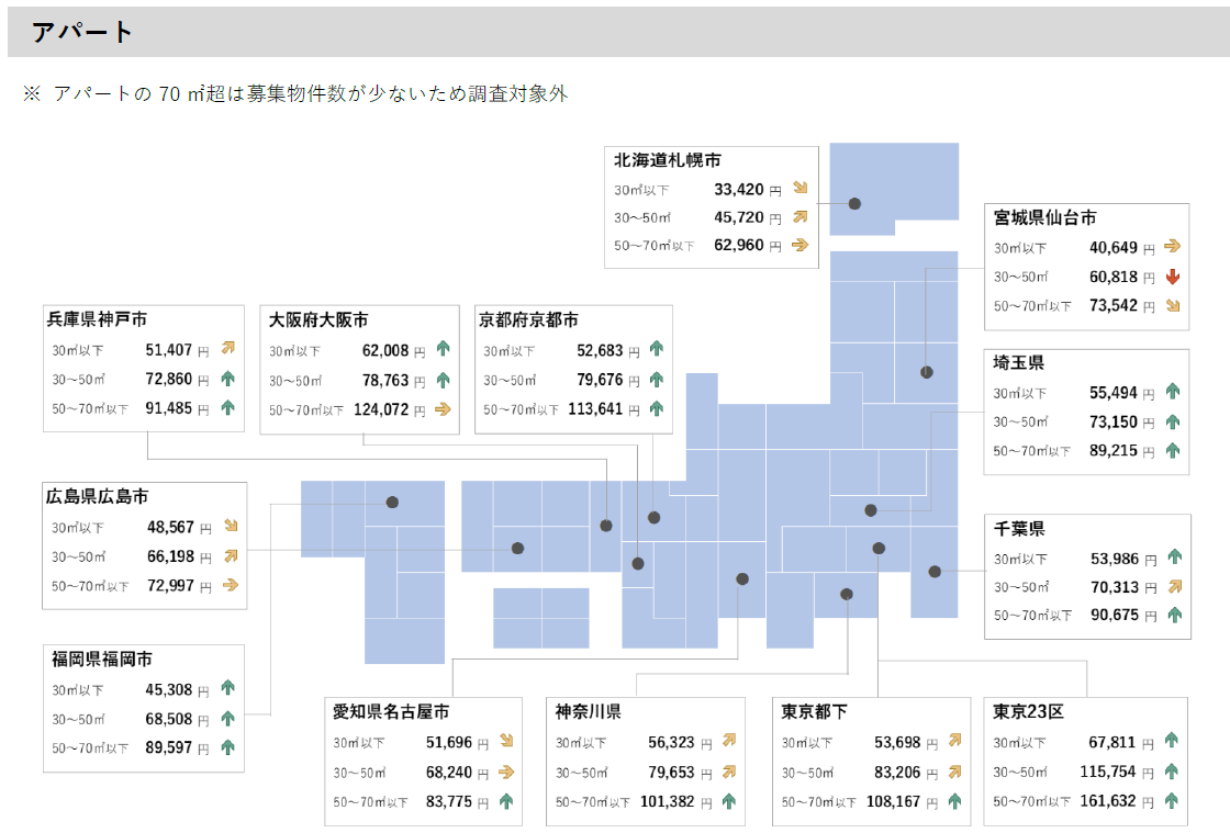 ・コメントでは、30㎡以下を「シングル向き」、30㎡~50㎡以下を「カップル向き」、50㎡~70㎡以下を「ファミリー向き」、70㎡超を「大型ファミリー向き」としています。