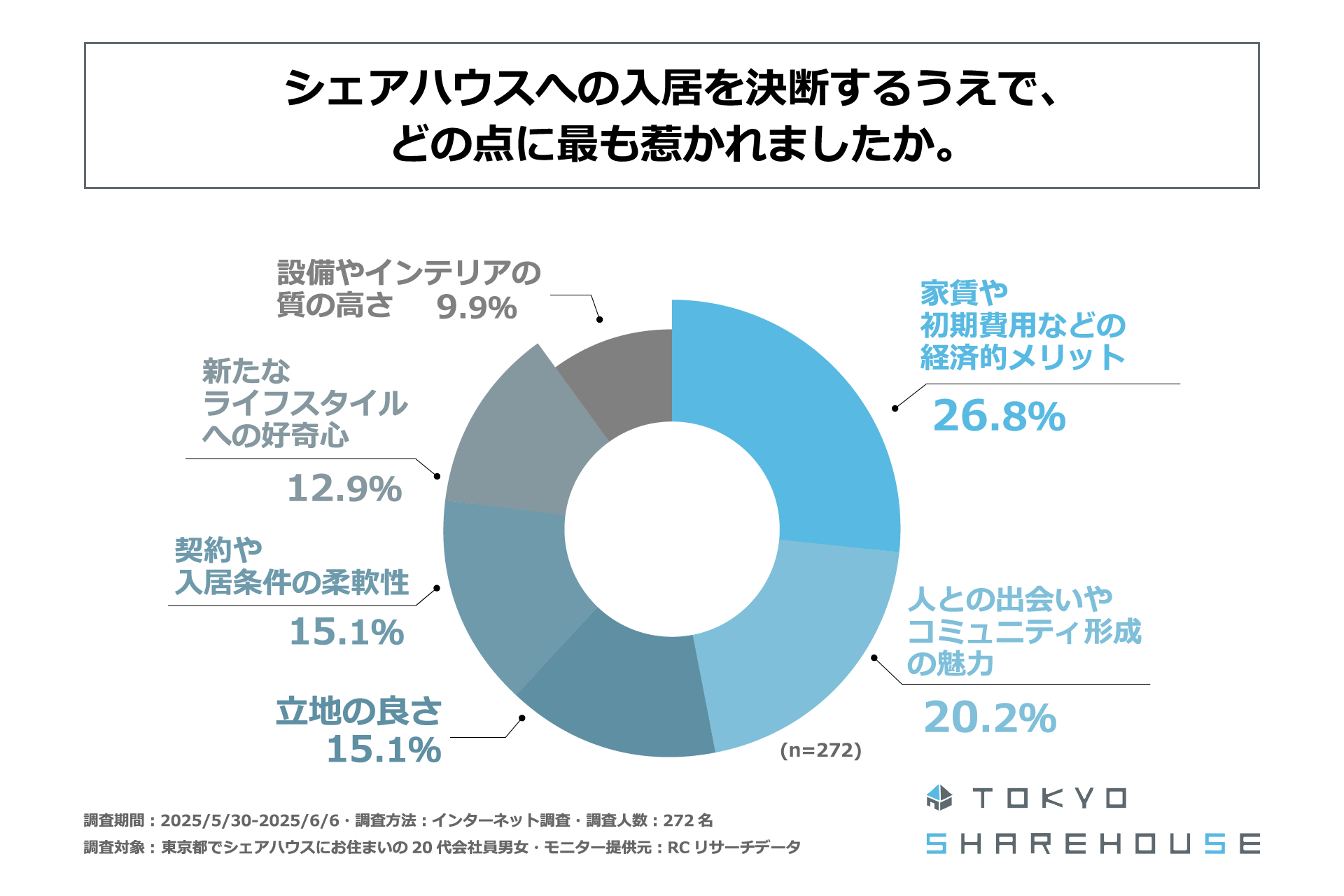 まず、「シェアハウスへの入居を決断するうえで、どの点に最も惹かれたか」を尋ねる設問への回答では、1位が「家賃や初期費用などの経済的メリット」で26.8%、2位が「人との出会いやコミュニティ形成の魅力」で20.2%、3位が同率で「契約や入居条件の柔軟性」と「立地の良さ」で15.1%という結果になりました。この結果から、東京都のシェアハウスに住む20代会社員の男女が、シェアハウスへの入居を決断するうえで、最も魅力的に感じたことは「家賃や初期費用などの経済的メリット」であることが明らかになりました。