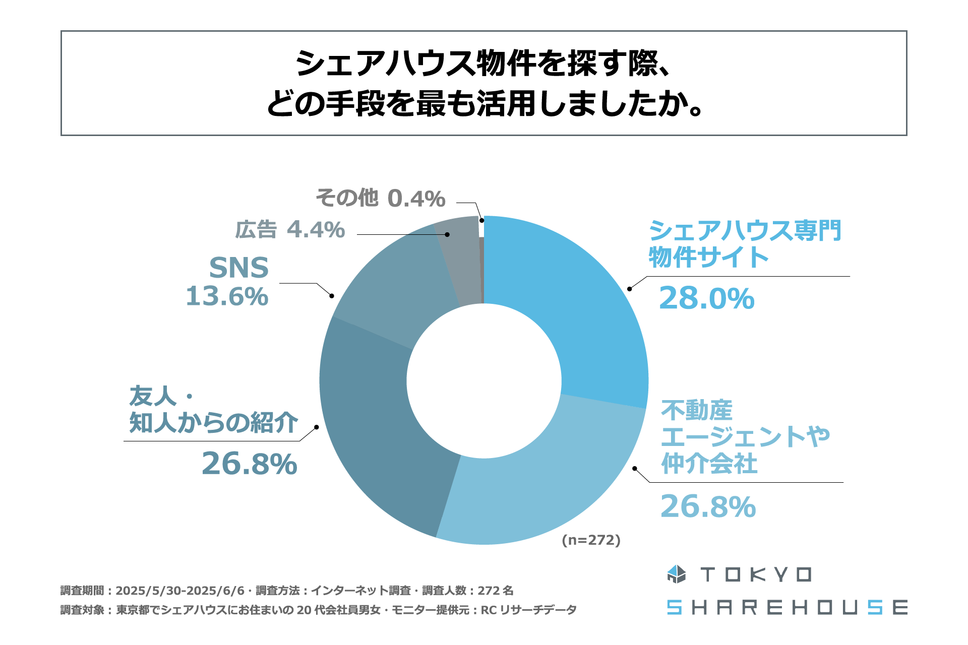 次に、「シェアハウス物件を探す際、どの手段を最も活用したか」を尋ねる設問への回答では、1位が「シェアハウス専門物件サイト」で28.0%、2位が同率で「不動産エージェントや仲介会社」と「友人・知人からの紹介」で26.8%という結果になりました。この結果から、シェアハウス物件を探す際に最も活用した手段は、「シェアハウス専門物件サイト」であることがわかりました。