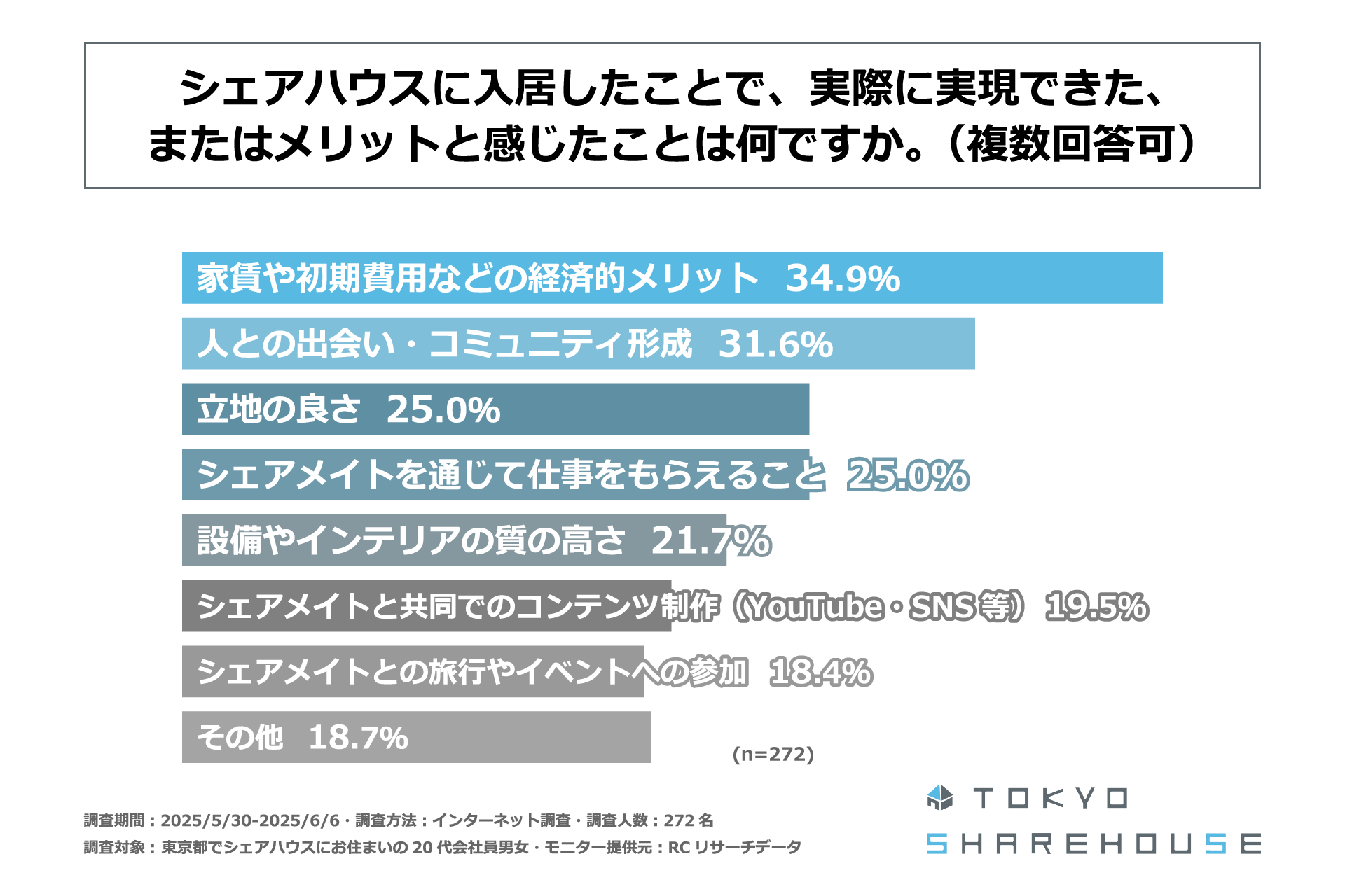 続いて、「シェアハウスに入居したことで、実際に実現できた、またはメリットと感じたこと」を尋ねる設問への回答では、1位が「家賃や初期費用などの経済的メリット」で34.9%、2位が「人との出会い・コミュニティ形成」で31.6%、3位が同率で「立地の良さ」と「シェアメイトを通じて仕事をもらえること」で25.0%という結果になりました。この結果から、シェアハウスに入居したことで、主に実現できた、またはメリットと感じたことは、「家賃や初期費用などのコスト削減」や「人との出会い・コミュニティ形成」であることが判明しました。