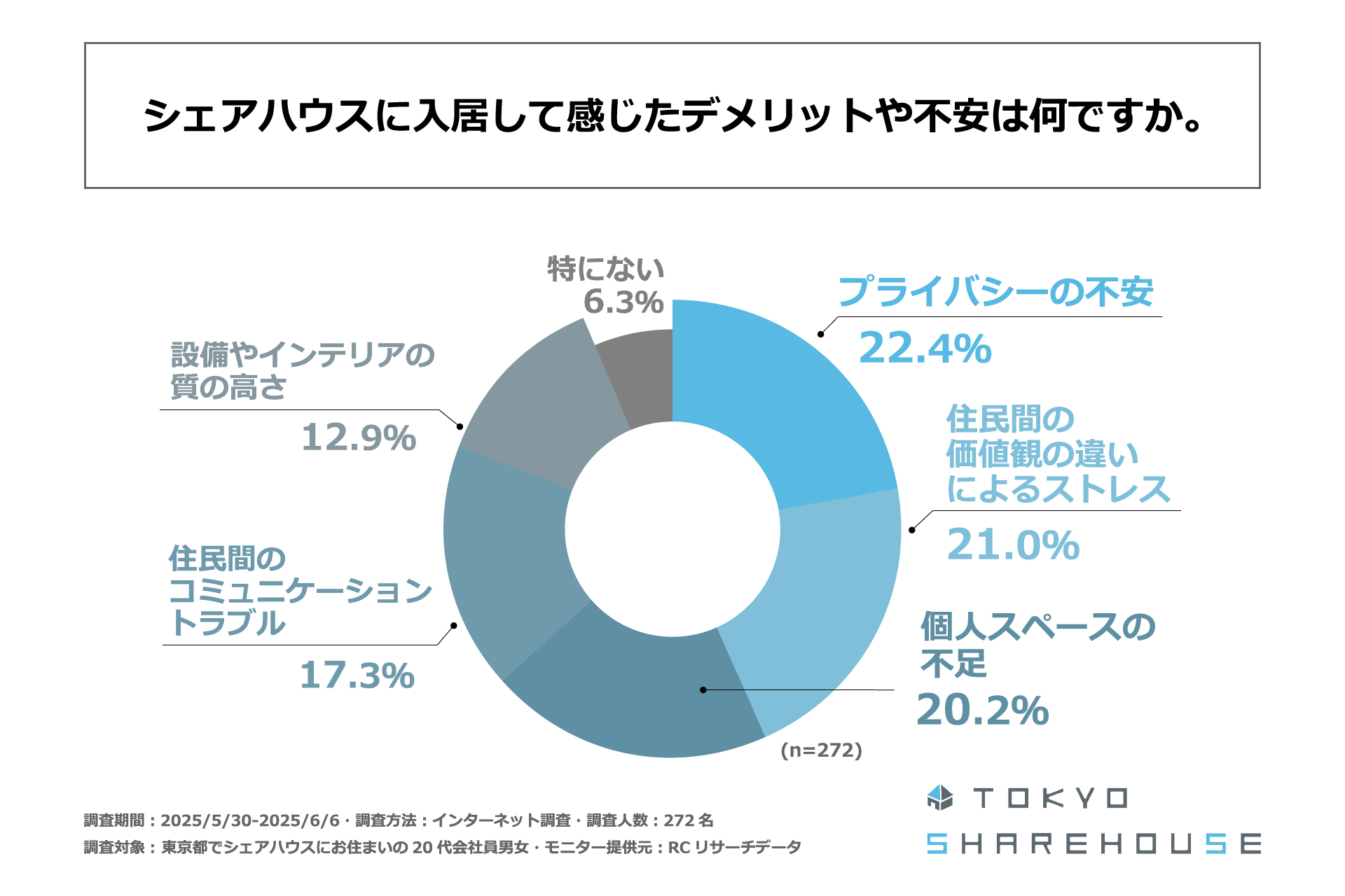 また、「シェアハウスに入居して感じたデメリットや不安」を尋ねる設問への回答では、1位が「プライバシーの不安」で22.4%、2位が「住民間の価値観の違いによるストレス」で21.0%、3位が「個人スペースの不足」で20.2%という結果になりました。この結果から、東京都のシェアハウスに住む20代会社員の最も多くが、シェアハウスに入居したことで感じたデメリットや不安は、「プライバシーの不安」であることが明らかになりました。