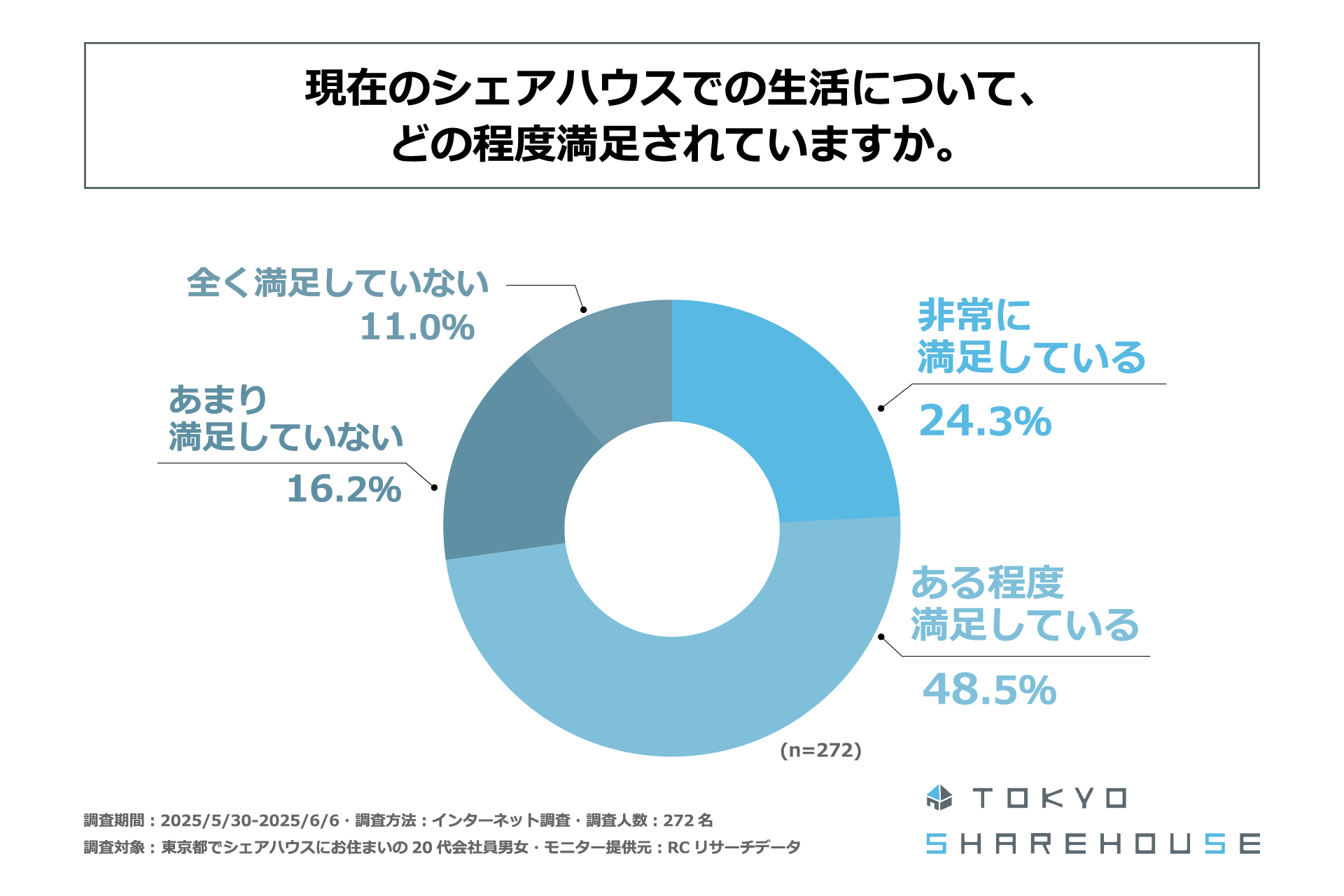 東京都のシェアハウスに住む20代会社員の男女の7割以上が、現在のシェアハウスでの生活に少なからず満足している