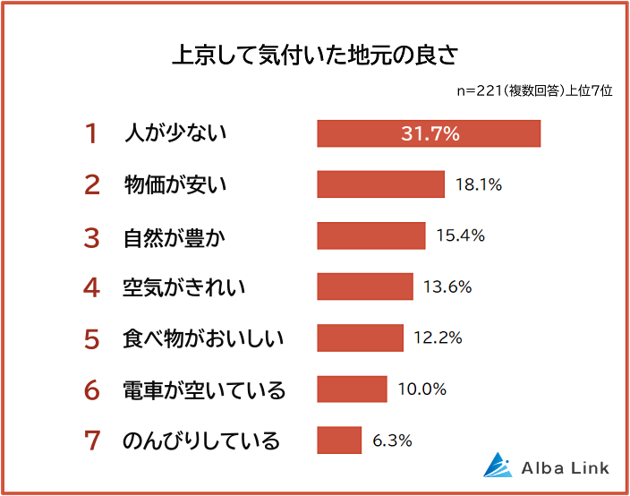 株式会社AlbaLink(本社:東京都江東区、代表取締役:河田 憲二)は、東京で仕事または居住している地方出身者221人を対象に「上京して気付いた地元の良さに関する意識調査」を実施し、そのデータをランキングにしました。