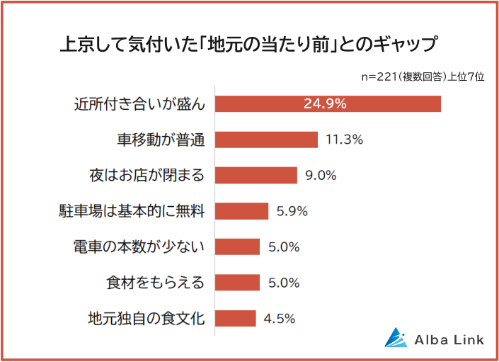 今回、株式会社AlbaLink( https://albalink.co.jp/ )が運営する空き家買取隊( https://akiya-kaitoritai.com/ )は、東京で仕事または居住している地方出身者221人を対象に「上京して気付いた地元の良さ」についてアンケート調査を実施しました。