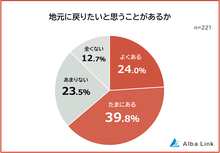 東京で仕事または居住している地方出身者221人に「地元に戻りたい(Uターンしたい)と思うことがあるか」と聞いたところ、「よくある(24.0%)」「たまにある(39.8%)」が合わせて63.8%となりました。